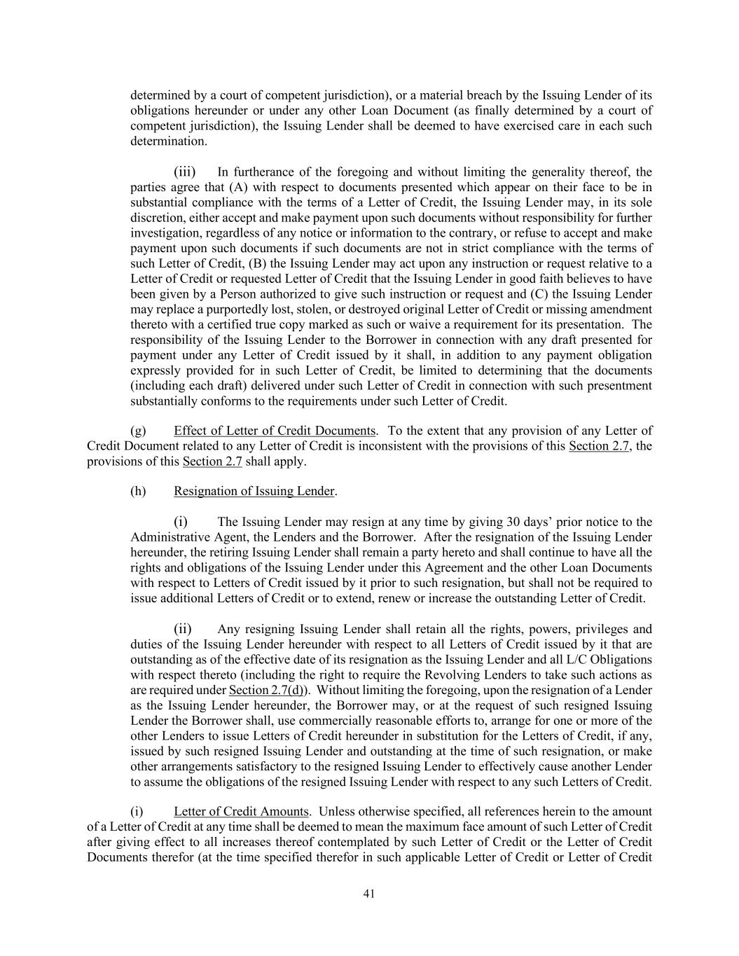 41 determined by a court of competent jurisdiction), or a material breach by the Issuing Lender of its obligations hereunder or under any other Loan Document (as finally determined by a court of competent jurisdiction), the Issuing Lender shall be deemed to have exercised care in each such determination. (iii) In furtherance of the foregoing and without limiting the generality thereof, the parties agree that (A) with respect to documents presented which appear on their face to be in substantial compliance with the terms of a Letter of Credit, the Issuing Lender may, in its sole discretion, either accept and make payment upon such documents without responsibility for further investigation, regardless of any notice or information to the contrary, or refuse to accept and make payment upon such documents if such documents are not in strict compliance with the terms of such Letter of Credit, (B) the Issuing Lender may act upon any instruction or request relative to a Letter of Credit or requested Letter of Credit that the Issuing Lender in good faith believes to have been given by a Person authorized to give such instruction or request and (C) the Issuing Lender may replace a purportedly lost, stolen, or destroyed original Letter of Credit or missing amendment thereto with a certified true copy marked as such or waive a requirement for its presentation. The responsibility of the Issuing Lender to the Borrower in connection with any draft presented for payment under any Letter of Credit issued by it shall, in addition to any payment obligation expressly provided for in such Letter of Credit, be limited to determining that the documents (including each draft) delivered under such Letter of Credit in connection with such presentment substantially conforms to the requirements under such Letter of Credit. (g) Effect of Letter of Credit Documents. To the extent that any provision of any Letter of Credit Document related to any Letter of Credit is inconsistent with the provisions of this Section 2.7, the provisions of this Section 2.7 shall apply. (h) Resignation of Issuing Lender. (i) The Issuing Lender may resign at any time by giving 30 days’ prior notice to the Administrative Agent, the Lenders and the Borrower. After the resignation of the Issuing Lender hereunder, the retiring Issuing Lender shall remain a party hereto and shall continue to have all the rights and obligations of the Issuing Lender under this Agreement and the other Loan Documents with respect to Letters of Credit issued by it prior to such resignation, but shall not be required to issue additional Letters of Credit or to extend, renew or increase the outstanding Letter of Credit. (ii) Any resigning Issuing Lender shall retain all the rights, powers, privileges and duties of the Issuing Lender hereunder with respect to all Letters of Credit issued by it that are outstanding as of the effective date of its resignation as the Issuing Lender and all L/C Obligations with respect thereto (including the right to require the Revolving Lenders to take such actions as are required under Section 2.7(d)). Without limiting the foregoing, upon the resignation of a Lender as the Issuing Lender hereunder, the Borrower may, or at the request of such resigned Issuing Lender the Borrower shall, use commercially reasonable efforts to, arrange for one or more of the other Lenders to issue Letters of Credit hereunder in substitution for the Letters of Credit, if any, issued by such resigned Issuing Lender and outstanding at the time of such resignation, or make other arrangements satisfactory to the resigned Issuing Lender to effectively cause another Lender to assume the obligations of the resigned Issuing Lender with respect to any such Letters of Credit. (i) Letter of Credit Amounts. Unless otherwise specified, all references herein to the amount of a Letter of Credit at any time shall be deemed to mean the maximum face amount of such Letter of Credit after giving effect to all increases thereof contemplated by such Letter of Credit or the Letter of Credit Documents therefor (at the time specified therefor in such applicable Letter of Credit or Letter of Credit