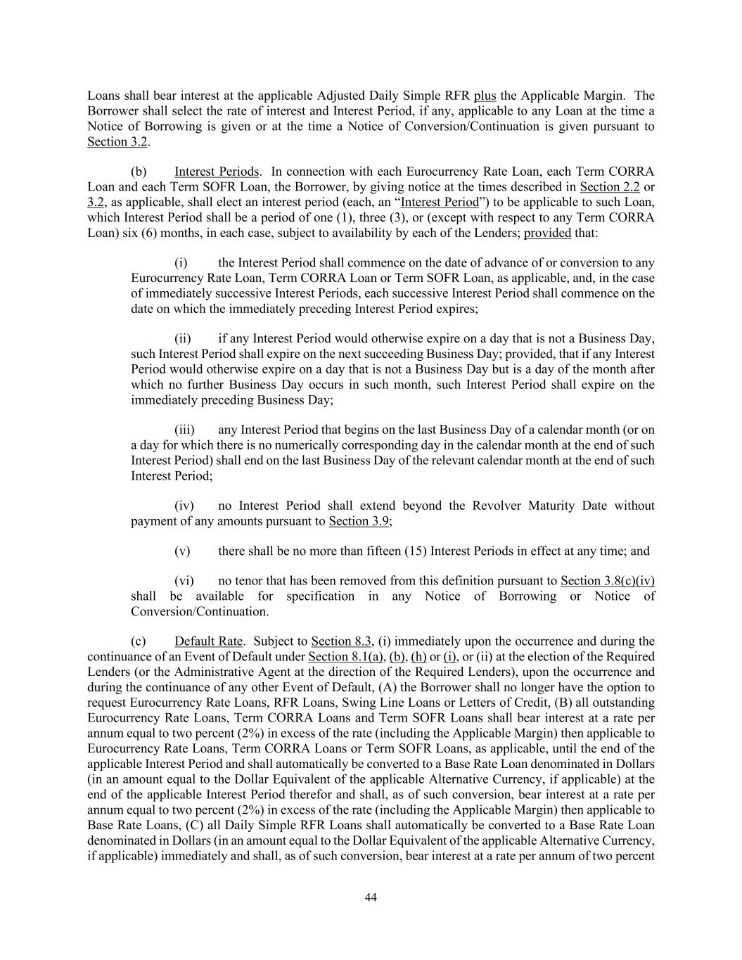 44 Loans shall bear interest at the applicable Adjusted Daily Simple RFR plus the Applicable Margin. The Borrower shall select the rate of interest and Interest Period, if any, applicable to any Loan at the time a Notice of Borrowing is given or at the time a Notice of Conversion/Continuation is given pursuant to Section 3.2. (b) Interest Periods. In connection with each Eurocurrency Rate Loan, each Term CORRA Loan and each Term SOFR Loan, the Borrower, by giving notice at the times described in Section 2.2 or 3.2, as applicable, shall elect an interest period (each, an “Interest Period”) to be applicable to such Loan, which Interest Period shall be a period of one (1), three (3), or (except with respect to any Term CORRA Loan) six (6) months, in each case, subject to availability by each of the Lenders; provided that: (i) the Interest Period shall commence on the date of advance of or conversion to any Eurocurrency Rate Loan, Term CORRA Loan or Term SOFR Loan, as applicable, and, in the case of immediately successive Interest Periods, each successive Interest Period shall commence on the date on which the immediately preceding Interest Period expires; (ii) if any Interest Period would otherwise expire on a day that is not a Business Day, such Interest Period shall expire on the next succeeding Business Day; provided, that if any Interest Period would otherwise expire on a day that is not a Business Day but is a day of the month after which no further Business Day occurs in such month, such Interest Period shall expire on the immediately preceding Business Day; (iii) any Interest Period that begins on the last Business Day of a calendar month (or on a day for which there is no numerically corresponding day in the calendar month at the end of such Interest Period) shall end on the last Business Day of the relevant calendar month at the end of such Interest Period; (iv) no Interest Period shall extend beyond the Revolver Maturity Date without payment of any amounts pursuant to Section 3.9; (v) there shall be no more than fifteen (15) Interest Periods in effect at any time; and (vi) no tenor that has been removed from this definition pursuant to Section 3.8(c)(iv) shall be available for specification in any Notice of Borrowing or Notice of Conversion/Continuation. (c) Default Rate. Subject to Section 8.3, (i) immediately upon the occurrence and during the continuance of an Event of Default under Section 8.1(a), (b), (h) or (i), or (ii) at the election of the Required Lenders (or the Administrative Agent at the direction of the Required Lenders), upon the occurrence and during the continuance of any other Event of Default, (A) the Borrower shall no longer have the option to request Eurocurrency Rate Loans, RFR Loans, Swing Line Loans or Letters of Credit, (B) all outstanding Eurocurrency Rate Loans, Term CORRA Loans and Term SOFR Loans shall bear interest at a rate per annum equal to two percent (2%) in excess of the rate (including the Applicable Margin) then applicable to Eurocurrency Rate Loans, Term CORRA Loans or Term SOFR Loans, as applicable, until the end of the applicable Interest Period and shall automatically be converted to a Base Rate Loan denominated in Dollars (in an amount equal to the Dollar Equivalent of the applicable Alternative Currency, if applicable) at the end of the applicable Interest Period therefor and shall, as of such conversion, bear interest at a rate per annum equal to two percent (2%) in excess of the rate (including the Applicable Margin) then applicable to Base Rate Loans, (C) all Daily Simple RFR Loans shall automatically be converted to a Base Rate Loan denominated in Dollars (in an amount equal to the Dollar Equivalent of the applicable Alternative Currency, if applicable) immediately and shall, as of such conversion, bear interest at a rate per annum of two percent
