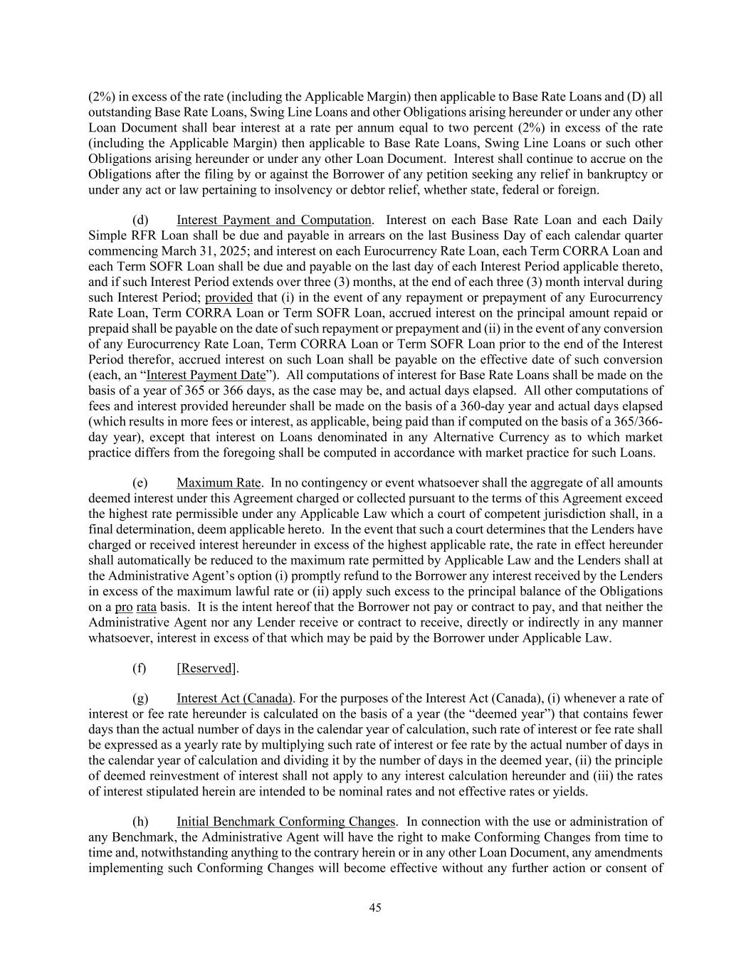 45 (2%) in excess of the rate (including the Applicable Margin) then applicable to Base Rate Loans and (D) all outstanding Base Rate Loans, Swing Line Loans and other Obligations arising hereunder or under any other Loan Document shall bear interest at a rate per annum equal to two percent (2%) in excess of the rate (including the Applicable Margin) then applicable to Base Rate Loans, Swing Line Loans or such other Obligations arising hereunder or under any other Loan Document. Interest shall continue to accrue on the Obligations after the filing by or against the Borrower of any petition seeking any relief in bankruptcy or under any act or law pertaining to insolvency or debtor relief, whether state, federal or foreign. (d) Interest Payment and Computation. Interest on each Base Rate Loan and each Daily Simple RFR Loan shall be due and payable in arrears on the last Business Day of each calendar quarter commencing March 31, 2025; and interest on each Eurocurrency Rate Loan, each Term CORRA Loan and each Term SOFR Loan shall be due and payable on the last day of each Interest Period applicable thereto, and if such Interest Period extends over three (3) months, at the end of each three (3) month interval during such Interest Period; provided that (i) in the event of any repayment or prepayment of any Eurocurrency Rate Loan, Term CORRA Loan or Term SOFR Loan, accrued interest on the principal amount repaid or prepaid shall be payable on the date of such repayment or prepayment and (ii) in the event of any conversion of any Eurocurrency Rate Loan, Term CORRA Loan or Term SOFR Loan prior to the end of the Interest Period therefor, accrued interest on such Loan shall be payable on the effective date of such conversion (each, an “Interest Payment Date”). All computations of interest for Base Rate Loans shall be made on the basis of a year of 365 or 366 days, as the case may be, and actual days elapsed. All other computations of fees and interest provided hereunder shall be made on the basis of a 360-day year and actual days elapsed (which results in more fees or interest, as applicable, being paid than if computed on the basis of a 365/366- day year), except that interest on Loans denominated in any Alternative Currency as to which market practice differs from the foregoing shall be computed in accordance with market practice for such Loans. (e) Maximum Rate. In no contingency or event whatsoever shall the aggregate of all amounts deemed interest under this Agreement charged or collected pursuant to the terms of this Agreement exceed the highest rate permissible under any Applicable Law which a court of competent jurisdiction shall, in a final determination, deem applicable hereto. In the event that such a court determines that the Lenders have charged or received interest hereunder in excess of the highest applicable rate, the rate in effect hereunder shall automatically be reduced to the maximum rate permitted by Applicable Law and the Lenders shall at the Administrative Agent’s option (i) promptly refund to the Borrower any interest received by the Lenders in excess of the maximum lawful rate or (ii) apply such excess to the principal balance of the Obligations on a pro rata basis. It is the intent hereof that the Borrower not pay or contract to pay, and that neither the Administrative Agent nor any Lender receive or contract to receive, directly or indirectly in any manner whatsoever, interest in excess of that which may be paid by the Borrower under Applicable Law. (f) [Reserved]. (g) Interest Act (Canada). For the purposes of the Interest Act (Canada), (i) whenever a rate of interest or fee rate hereunder is calculated on the basis of a year (the “deemed year”) that contains fewer days than the actual number of days in the calendar year of calculation, such rate of interest or fee rate shall be expressed as a yearly rate by multiplying such rate of interest or fee rate by the actual number of days in the calendar year of calculation and dividing it by the number of days in the deemed year, (ii) the principle of deemed reinvestment of interest shall not apply to any interest calculation hereunder and (iii) the rates of interest stipulated herein are intended to be nominal rates and not effective rates or yields. (h) Initial Benchmark Conforming Changes. In connection with the use or administration of any Benchmark, the Administrative Agent will have the right to make Conforming Changes from time to time and, notwithstanding anything to the contrary herein or in any other Loan Document, any amendments implementing such Conforming Changes will become effective without any further action or consent of