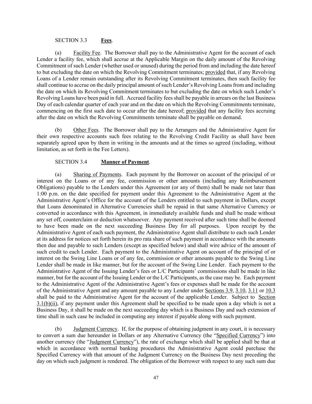 47 SECTION 3.3 Fees. (a) Facility Fee. The Borrower shall pay to the Administrative Agent for the account of each Lender a facility fee, which shall accrue at the Applicable Margin on the daily amount of the Revolving Commitment of such Lender (whether used or unused) during the period from and including the date hereof to but excluding the date on which the Revolving Commitment terminates; provided that, if any Revolving Loans of a Lender remain outstanding after its Revolving Commitment terminates, then such facility fee shall continue to accrue on the daily principal amount of such Lender’s Revolving Loans from and including the date on which its Revolving Commitment terminates to but excluding the date on which such Lender’s Revolving Loans have been paid in full. Accrued facility fees shall be payable in arrears on the last Business Day of each calendar quarter of each year and on the date on which the Revolving Commitments terminate, commencing on the first such date to occur after the date hereof; provided that any facility fees accruing after the date on which the Revolving Commitments terminate shall be payable on demand. (b) Other Fees. The Borrower shall pay to the Arrangers and the Administrative Agent for their own respective accounts such fees relating to the Revolving Credit Facility as shall have been separately agreed upon by them in writing in the amounts and at the times so agreed (including, without limitation, as set forth in the Fee Letters). SECTION 3.4 Manner of Payment. (a) Sharing of Payments. Each payment by the Borrower on account of the principal of or interest on the Loans or of any fee, commission or other amounts (including any Reimbursement Obligations) payable to the Lenders under this Agreement (or any of them) shall be made not later than 1:00 p.m. on the date specified for payment under this Agreement to the Administrative Agent at the Administrative Agent’s Office for the account of the Lenders entitled to such payment in Dollars, except that Loans denominated in Alternative Currencies shall be repaid in that same Alternative Currency or converted in accordance with this Agreement, in immediately available funds and shall be made without any set off, counterclaim or deduction whatsoever. Any payment received after such time shall be deemed to have been made on the next succeeding Business Day for all purposes. Upon receipt by the Administrative Agent of each such payment, the Administrative Agent shall distribute to each such Lender at its address for notices set forth herein its pro rata share of such payment in accordance with the amounts then due and payable to such Lenders (except as specified below) and shall wire advice of the amount of such credit to each Lender. Each payment to the Administrative Agent on account of the principal of or interest on the Swing Line Loans or of any fee, commission or other amounts payable to the Swing Line Lender shall be made in like manner, but for the account of the Swing Line Lender. Each payment to the Administrative Agent of the Issuing Lender’s fees or L/C Participants’ commissions shall be made in like manner, but for the account of the Issuing Lender or the L/C Participants, as the case may be. Each payment to the Administrative Agent of the Administrative Agent’s fees or expenses shall be made for the account of the Administrative Agent and any amount payable to any Lender under Sections 3.9, 3.10, 3.11 or 10.3 shall be paid to the Administrative Agent for the account of the applicable Lender. Subject to Section 3.1(b)(ii), if any payment under this Agreement shall be specified to be made upon a day which is not a Business Day, it shall be made on the next succeeding day which is a Business Day and such extension of time shall in such case be included in computing any interest if payable along with such payment. (b) Judgment Currency. If, for the purpose of obtaining judgment in any court, it is necessary to convert a sum due hereunder in Dollars or any Alternative Currency (the “Specified Currency”) into another currency (the “Judgment Currency”), the rate of exchange which shall be applied shall be that at which in accordance with normal banking procedures the Administrative Agent could purchase the Specified Currency with that amount of the Judgment Currency on the Business Day next preceding the day on which such judgment is rendered. The obligation of the Borrower with respect to any such sum due