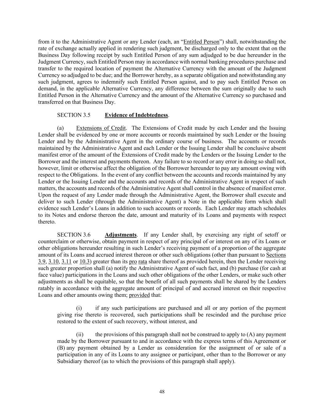 48 from it to the Administrative Agent or any Lender (each, an “Entitled Person”) shall, notwithstanding the rate of exchange actually applied in rendering such judgment, be discharged only to the extent that on the Business Day following receipt by such Entitled Person of any sum adjudged to be due hereunder in the Judgment Currency, such Entitled Person may in accordance with normal banking procedures purchase and transfer to the required location of payment the Alternative Currency with the amount of the Judgment Currency so adjudged to be due; and the Borrower hereby, as a separate obligation and notwithstanding any such judgment, agrees to indemnify such Entitled Person against, and to pay such Entitled Person on demand, in the applicable Alternative Currency, any difference between the sum originally due to such Entitled Person in the Alternative Currency and the amount of the Alternative Currency so purchased and transferred on that Business Day. SECTION 3.5 Evidence of Indebtedness. (a) Extensions of Credit. The Extensions of Credit made by each Lender and the Issuing Lender shall be evidenced by one or more accounts or records maintained by such Lender or the Issuing Lender and by the Administrative Agent in the ordinary course of business. The accounts or records maintained by the Administrative Agent and each Lender or the Issuing Lender shall be conclusive absent manifest error of the amount of the Extensions of Credit made by the Lenders or the Issuing Lender to the Borrower and the interest and payments thereon. Any failure to so record or any error in doing so shall not, however, limit or otherwise affect the obligation of the Borrower hereunder to pay any amount owing with respect to the Obligations. In the event of any conflict between the accounts and records maintained by any Lender or the Issuing Lender and the accounts and records of the Administrative Agent in respect of such matters, the accounts and records of the Administrative Agent shall control in the absence of manifest error. Upon the request of any Lender made through the Administrative Agent, the Borrower shall execute and deliver to such Lender (through the Administrative Agent) a Note in the applicable form which shall evidence such Lender’s Loans in addition to such accounts or records. Each Lender may attach schedules to its Notes and endorse thereon the date, amount and maturity of its Loans and payments with respect thereto. SECTION 3.6 Adjustments. If any Lender shall, by exercising any right of setoff or counterclaim or otherwise, obtain payment in respect of any principal of or interest on any of its Loans or other obligations hereunder resulting in such Lender’s receiving payment of a proportion of the aggregate amount of its Loans and accrued interest thereon or other such obligations (other than pursuant to Sections 3.9, 3.10, 3.11 or 10.3) greater than its pro rata share thereof as provided herein, then the Lender receiving such greater proportion shall (a) notify the Administrative Agent of such fact, and (b) purchase (for cash at face value) participations in the Loans and such other obligations of the other Lenders, or make such other adjustments as shall be equitable, so that the benefit of all such payments shall be shared by the Lenders ratably in accordance with the aggregate amount of principal of and accrued interest on their respective Loans and other amounts owing them; provided that: (i) if any such participations are purchased and all or any portion of the payment giving rise thereto is recovered, such participations shall be rescinded and the purchase price restored to the extent of such recovery, without interest, and (ii) the provisions of this paragraph shall not be construed to apply to (A) any payment made by the Borrower pursuant to and in accordance with the express terms of this Agreement or (B) any payment obtained by a Lender as consideration for the assignment of or sale of a participation in any of its Loans to any assignee or participant, other than to the Borrower or any Subsidiary thereof (as to which the provisions of this paragraph shall apply).