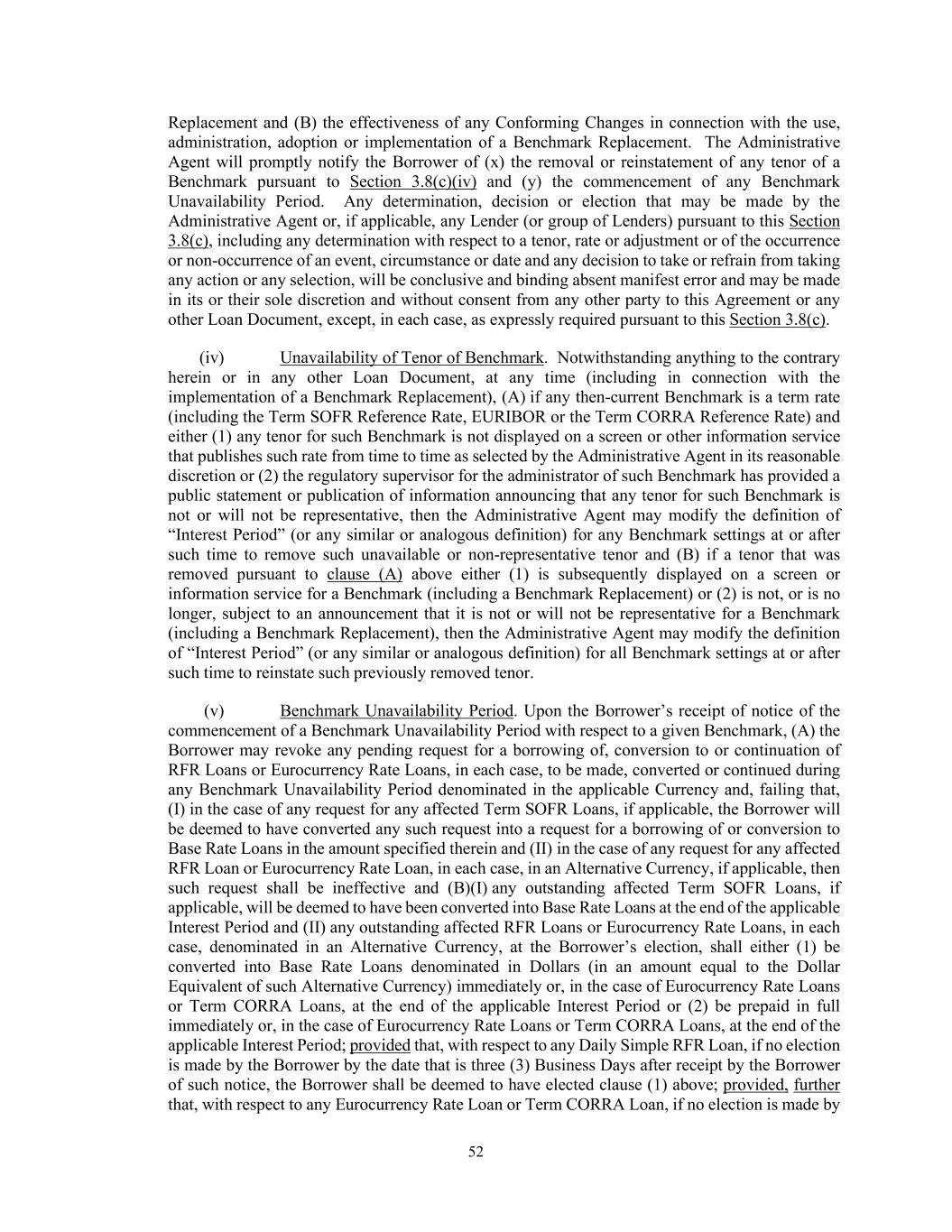 52 Replacement and (B) the effectiveness of any Conforming Changes in connection with the use, administration, adoption or implementation of a Benchmark Replacement. The Administrative Agent will promptly notify the Borrower of (x) the removal or reinstatement of any tenor of a Benchmark pursuant to Section 3.8(c)(iv) and (y) the commencement of any Benchmark Unavailability Period. Any determination, decision or election that may be made by the Administrative Agent or, if applicable, any Lender (or group of Lenders) pursuant to this Section 3.8(c), including any determination with respect to a tenor, rate or adjustment or of the occurrence or non-occurrence of an event, circumstance or date and any decision to take or refrain from taking any action or any selection, will be conclusive and binding absent manifest error and may be made in its or their sole discretion and without consent from any other party to this Agreement or any other Loan Document, except, in each case, as expressly required pursuant to this Section 3.8(c). (iv) Unavailability of Tenor of Benchmark. Notwithstanding anything to the contrary herein or in any other Loan Document, at any time (including in connection with the implementation of a Benchmark Replacement), (A) if any then-current Benchmark is a term rate (including the Term SOFR Reference Rate, EURIBOR or the Term CORRA Reference Rate) and either (1) any tenor for such Benchmark is not displayed on a screen or other information service that publishes such rate from time to time as selected by the Administrative Agent in its reasonable discretion or (2) the regulatory supervisor for the administrator of such Benchmark has provided a public statement or publication of information announcing that any tenor for such Benchmark is not or will not be representative, then the Administrative Agent may modify the definition of “Interest Period” (or any similar or analogous definition) for any Benchmark settings at or after such time to remove such unavailable or non-representative tenor and (B) if a tenor that was removed pursuant to clause (A) above either (1) is subsequently displayed on a screen or information service for a Benchmark (including a Benchmark Replacement) or (2) is not, or is no longer, subject to an announcement that it is not or will not be representative for a Benchmark (including a Benchmark Replacement), then the Administrative Agent may modify the definition of “Interest Period” (or any similar or analogous definition) for all Benchmark settings at or after such time to reinstate such previously removed tenor. (v) Benchmark Unavailability Period. Upon the Borrower’s receipt of notice of the commencement of a Benchmark Unavailability Period with respect to a given Benchmark, (A) the Borrower may revoke any pending request for a borrowing of, conversion to or continuation of RFR Loans or Eurocurrency Rate Loans, in each case, to be made, converted or continued during any Benchmark Unavailability Period denominated in the applicable Currency and, failing that, (I) in the case of any request for any affected Term SOFR Loans, if applicable, the Borrower will be deemed to have converted any such request into a request for a borrowing of or conversion to Base Rate Loans in the amount specified therein and (II) in the case of any request for any affected RFR Loan or Eurocurrency Rate Loan, in each case, in an Alternative Currency, if applicable, then such request shall be ineffective and (B)(I) any outstanding affected Term SOFR Loans, if applicable, will be deemed to have been converted into Base Rate Loans at the end of the applicable Interest Period and (II) any outstanding affected RFR Loans or Eurocurrency Rate Loans, in each case, denominated in an Alternative Currency, at the Borrower’s election, shall either (1) be converted into Base Rate Loans denominated in Dollars (in an amount equal to the Dollar Equivalent of such Alternative Currency) immediately or, in the case of Eurocurrency Rate Loans or Term CORRA Loans, at the end of the applicable Interest Period or (2) be prepaid in full immediately or, in the case of Eurocurrency Rate Loans or Term CORRA Loans, at the end of the applicable Interest Period; provided that, with respect to any Daily Simple RFR Loan, if no election is made by the Borrower by the date that is three (3) Business Days after receipt by the Borrower of such notice, the Borrower shall be deemed to have elected clause (1) above; provided, further that, with respect to any Eurocurrency Rate Loan or Term CORRA Loan, if no election is made by