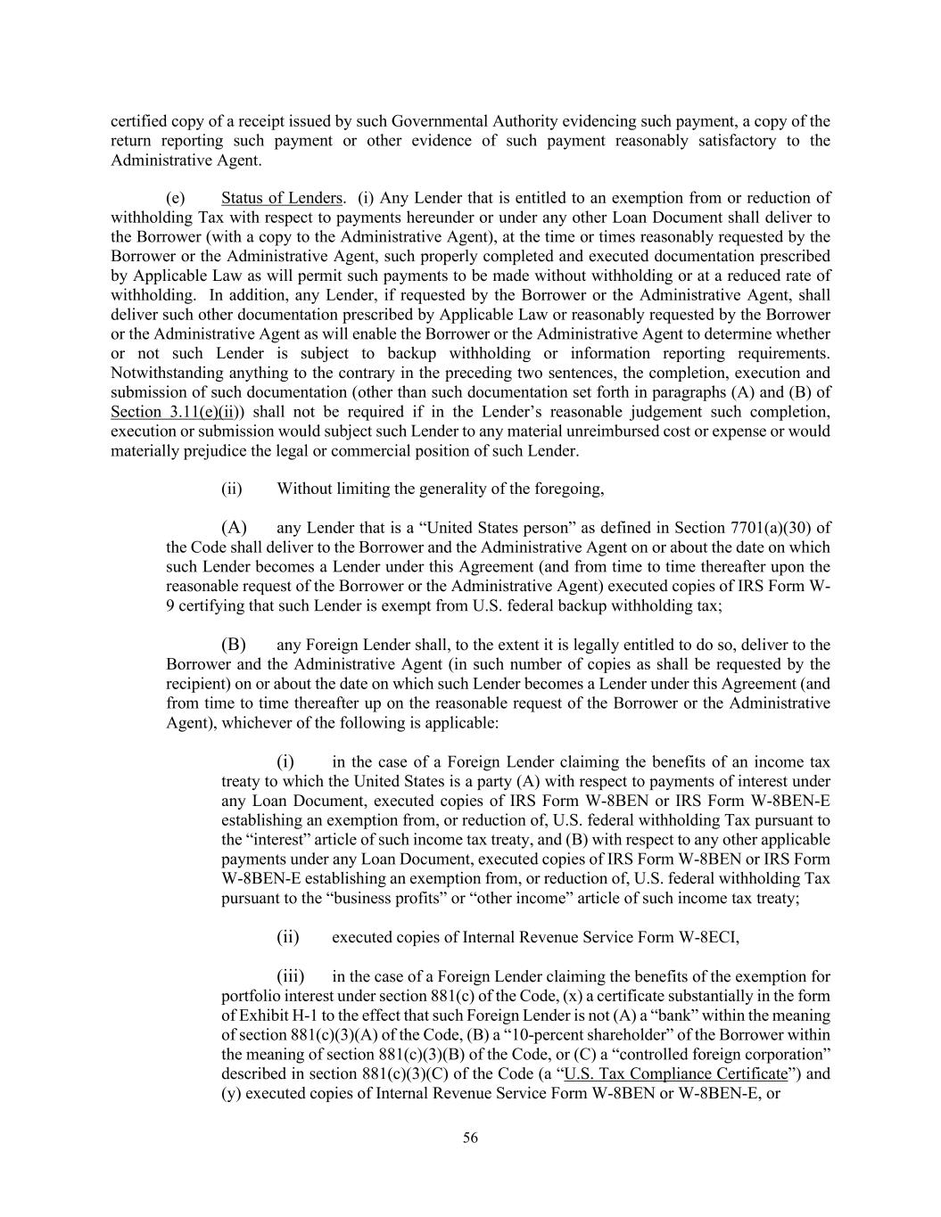 56 certified copy of a receipt issued by such Governmental Authority evidencing such payment, a copy of the return reporting such payment or other evidence of such payment reasonably satisfactory to the Administrative Agent. (e) Status of Lenders. (i) Any Lender that is entitled to an exemption from or reduction of withholding Tax with respect to payments hereunder or under any other Loan Document shall deliver to the Borrower (with a copy to the Administrative Agent), at the time or times reasonably requested by the Borrower or the Administrative Agent, such properly completed and executed documentation prescribed by Applicable Law as will permit such payments to be made without withholding or at a reduced rate of withholding. In addition, any Lender, if requested by the Borrower or the Administrative Agent, shall deliver such other documentation prescribed by Applicable Law or reasonably requested by the Borrower or the Administrative Agent as will enable the Borrower or the Administrative Agent to determine whether or not such Lender is subject to backup withholding or information reporting requirements. Notwithstanding anything to the contrary in the preceding two sentences, the completion, execution and submission of such documentation (other than such documentation set forth in paragraphs (A) and (B) of Section 3.11(e)(ii)) shall not be required if in the Lender’s reasonable judgement such completion, execution or submission would subject such Lender to any material unreimbursed cost or expense or would materially prejudice the legal or commercial position of such Lender. (ii) Without limiting the generality of the foregoing, (A) any Lender that is a “United States person” as defined in Section 7701(a)(30) of the Code shall deliver to the Borrower and the Administrative Agent on or about the date on which such Lender becomes a Lender under this Agreement (and from time to time thereafter upon the reasonable request of the Borrower or the Administrative Agent) executed copies of IRS Form W- 9 certifying that such Lender is exempt from U.S. federal backup withholding tax; (B) any Foreign Lender shall, to the extent it is legally entitled to do so, deliver to the Borrower and the Administrative Agent (in such number of copies as shall be requested by the recipient) on or about the date on which such Lender becomes a Lender under this Agreement (and from time to time thereafter up on the reasonable request of the Borrower or the Administrative Agent), whichever of the following is applicable: (i) in the case of a Foreign Lender claiming the benefits of an income tax treaty to which the United States is a party (A) with respect to payments of interest under any Loan Document, executed copies of IRS Form W-8BEN or IRS Form W-8BEN-E establishing an exemption from, or reduction of, U.S. federal withholding Tax pursuant to the “interest” article of such income tax treaty, and (B) with respect to any other applicable payments under any Loan Document, executed copies of IRS Form W-8BEN or IRS Form W-8BEN-E establishing an exemption from, or reduction of, U.S. federal withholding Tax pursuant to the “business profits” or “other income” article of such income tax treaty; (ii) executed copies of Internal Revenue Service Form W-8ECI, (iii) in the case of a Foreign Lender claiming the benefits of the exemption for portfolio interest under section 881(c) of the Code, (x) a certificate substantially in the form of Exhibit H-1 to the effect that such Foreign Lender is not (A) a “bank” within the meaning of section 881(c)(3)(A) of the Code, (B) a “10-percent shareholder” of the Borrower within the meaning of section 881(c)(3)(B) of the Code, or (C) a “controlled foreign corporation” described in section 881(c)(3)(C) of the Code (a “U.S. Tax Compliance Certificate”) and (y) executed copies of Internal Revenue Service Form W-8BEN or W-8BEN-E, or