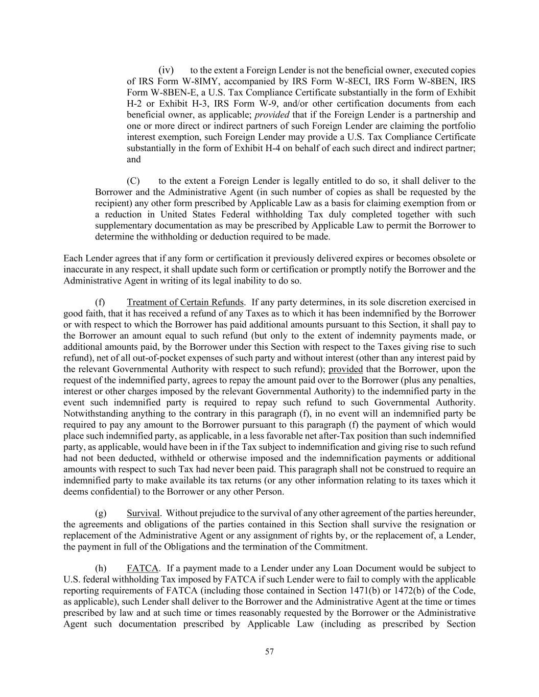57 (iv) to the extent a Foreign Lender is not the beneficial owner, executed copies of IRS Form W-8IMY, accompanied by IRS Form W-8ECI, IRS Form W-8BEN, IRS Form W-8BEN-E, a U.S. Tax Compliance Certificate substantially in the form of Exhibit H-2 or Exhibit H-3, IRS Form W-9, and/or other certification documents from each beneficial owner, as applicable; provided that if the Foreign Lender is a partnership and one or more direct or indirect partners of such Foreign Lender are claiming the portfolio interest exemption, such Foreign Lender may provide a U.S. Tax Compliance Certificate substantially in the form of Exhibit H-4 on behalf of each such direct and indirect partner; and (C) to the extent a Foreign Lender is legally entitled to do so, it shall deliver to the Borrower and the Administrative Agent (in such number of copies as shall be requested by the recipient) any other form prescribed by Applicable Law as a basis for claiming exemption from or a reduction in United States Federal withholding Tax duly completed together with such supplementary documentation as may be prescribed by Applicable Law to permit the Borrower to determine the withholding or deduction required to be made. Each Lender agrees that if any form or certification it previously delivered expires or becomes obsolete or inaccurate in any respect, it shall update such form or certification or promptly notify the Borrower and the Administrative Agent in writing of its legal inability to do so. (f) Treatment of Certain Refunds. If any party determines, in its sole discretion exercised in good faith, that it has received a refund of any Taxes as to which it has been indemnified by the Borrower or with respect to which the Borrower has paid additional amounts pursuant to this Section, it shall pay to the Borrower an amount equal to such refund (but only to the extent of indemnity payments made, or additional amounts paid, by the Borrower under this Section with respect to the Taxes giving rise to such refund), net of all out-of-pocket expenses of such party and without interest (other than any interest paid by the relevant Governmental Authority with respect to such refund); provided that the Borrower, upon the request of the indemnified party, agrees to repay the amount paid over to the Borrower (plus any penalties, interest or other charges imposed by the relevant Governmental Authority) to the indemnified party in the event such indemnified party is required to repay such refund to such Governmental Authority. Notwithstanding anything to the contrary in this paragraph (f), in no event will an indemnified party be required to pay any amount to the Borrower pursuant to this paragraph (f) the payment of which would place such indemnified party, as applicable, in a less favorable net after-Tax position than such indemnified party, as applicable, would have been in if the Tax subject to indemnification and giving rise to such refund had not been deducted, withheld or otherwise imposed and the indemnification payments or additional amounts with respect to such Tax had never been paid. This paragraph shall not be construed to require an indemnified party to make available its tax returns (or any other information relating to its taxes which it deems confidential) to the Borrower or any other Person. (g) Survival. Without prejudice to the survival of any other agreement of the parties hereunder, the agreements and obligations of the parties contained in this Section shall survive the resignation or replacement of the Administrative Agent or any assignment of rights by, or the replacement of, a Lender, the payment in full of the Obligations and the termination of the Commitment. (h) FATCA. If a payment made to a Lender under any Loan Document would be subject to U.S. federal withholding Tax imposed by FATCA if such Lender were to fail to comply with the applicable reporting requirements of FATCA (including those contained in Section 1471(b) or 1472(b) of the Code, as applicable), such Lender shall deliver to the Borrower and the Administrative Agent at the time or times prescribed by law and at such time or times reasonably requested by the Borrower or the Administrative Agent such documentation prescribed by Applicable Law (including as prescribed by Section
