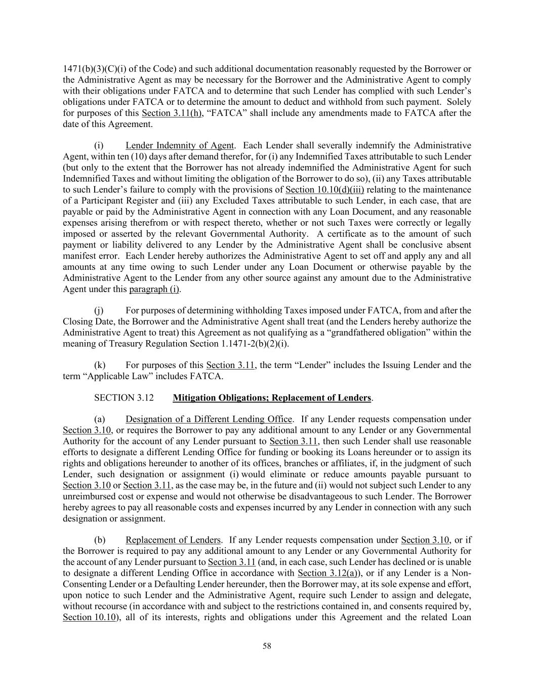 58 1471(b)(3)(C)(i) of the Code) and such additional documentation reasonably requested by the Borrower or the Administrative Agent as may be necessary for the Borrower and the Administrative Agent to comply with their obligations under FATCA and to determine that such Lender has complied with such Lender’s obligations under FATCA or to determine the amount to deduct and withhold from such payment. Solely for purposes of this Section 3.11(h), “FATCA” shall include any amendments made to FATCA after the date of this Agreement. (i) Lender Indemnity of Agent. Each Lender shall severally indemnify the Administrative Agent, within ten (10) days after demand therefor, for (i) any Indemnified Taxes attributable to such Lender (but only to the extent that the Borrower has not already indemnified the Administrative Agent for such Indemnified Taxes and without limiting the obligation of the Borrower to do so), (ii) any Taxes attributable to such Lender’s failure to comply with the provisions of Section 10.10(d)(iii) relating to the maintenance of a Participant Register and (iii) any Excluded Taxes attributable to such Lender, in each case, that are payable or paid by the Administrative Agent in connection with any Loan Document, and any reasonable expenses arising therefrom or with respect thereto, whether or not such Taxes were correctly or legally imposed or asserted by the relevant Governmental Authority. A certificate as to the amount of such payment or liability delivered to any Lender by the Administrative Agent shall be conclusive absent manifest error. Each Lender hereby authorizes the Administrative Agent to set off and apply any and all amounts at any time owing to such Lender under any Loan Document or otherwise payable by the Administrative Agent to the Lender from any other source against any amount due to the Administrative Agent under this paragraph (i). (j) For purposes of determining withholding Taxes imposed under FATCA, from and after the Closing Date, the Borrower and the Administrative Agent shall treat (and the Lenders hereby authorize the Administrative Agent to treat) this Agreement as not qualifying as a “grandfathered obligation” within the meaning of Treasury Regulation Section 1.1471-2(b)(2)(i). (k) For purposes of this Section 3.11, the term “Lender” includes the Issuing Lender and the term “Applicable Law” includes FATCA. SECTION 3.12 Mitigation Obligations; Replacement of Lenders. (a) Designation of a Different Lending Office. If any Lender requests compensation under Section 3.10, or requires the Borrower to pay any additional amount to any Lender or any Governmental Authority for the account of any Lender pursuant to Section 3.11, then such Lender shall use reasonable efforts to designate a different Lending Office for funding or booking its Loans hereunder or to assign its rights and obligations hereunder to another of its offices, branches or affiliates, if, in the judgment of such Lender, such designation or assignment (i) would eliminate or reduce amounts payable pursuant to Section 3.10 or Section 3.11, as the case may be, in the future and (ii) would not subject such Lender to any unreimbursed cost or expense and would not otherwise be disadvantageous to such Lender. The Borrower hereby agrees to pay all reasonable costs and expenses incurred by any Lender in connection with any such designation or assignment. (b) Replacement of Lenders. If any Lender requests compensation under Section 3.10, or if the Borrower is required to pay any additional amount to any Lender or any Governmental Authority for the account of any Lender pursuant to Section 3.11 (and, in each case, such Lender has declined or is unable to designate a different Lending Office in accordance with Section 3.12(a)), or if any Lender is a Non- Consenting Lender or a Defaulting Lender hereunder, then the Borrower may, at its sole expense and effort, upon notice to such Lender and the Administrative Agent, require such Lender to assign and delegate, without recourse (in accordance with and subject to the restrictions contained in, and consents required by, Section 10.10), all of its interests, rights and obligations under this Agreement and the related Loan