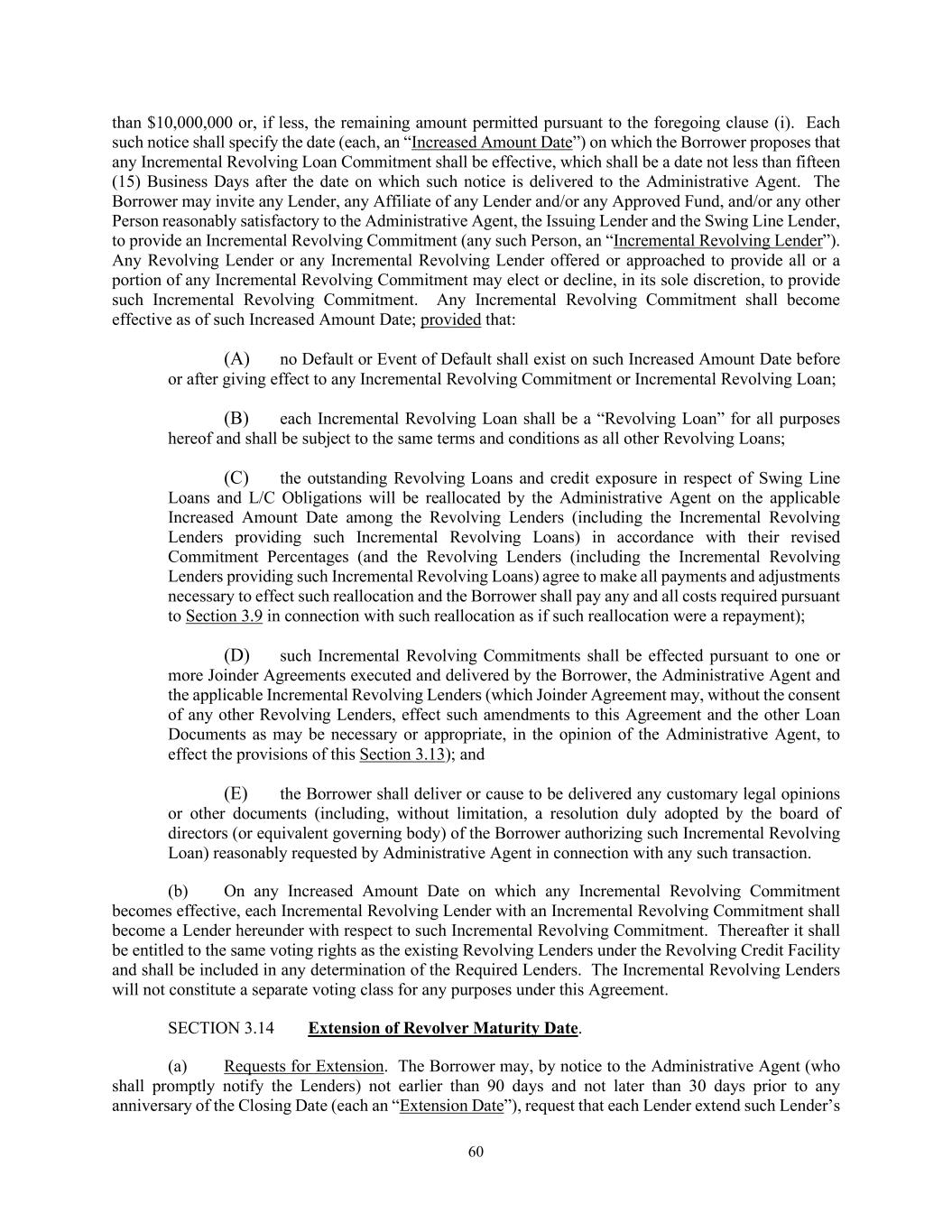 60 than $10,000,000 or, if less, the remaining amount permitted pursuant to the foregoing clause (i). Each such notice shall specify the date (each, an “Increased Amount Date”) on which the Borrower proposes that any Incremental Revolving Loan Commitment shall be effective, which shall be a date not less than fifteen (15) Business Days after the date on which such notice is delivered to the Administrative Agent. The Borrower may invite any Lender, any Affiliate of any Lender and/or any Approved Fund, and/or any other Person reasonably satisfactory to the Administrative Agent, the Issuing Lender and the Swing Line Lender, to provide an Incremental Revolving Commitment (any such Person, an “Incremental Revolving Lender”). Any Revolving Lender or any Incremental Revolving Lender offered or approached to provide all or a portion of any Incremental Revolving Commitment may elect or decline, in its sole discretion, to provide such Incremental Revolving Commitment. Any Incremental Revolving Commitment shall become effective as of such Increased Amount Date; provided that: (A) no Default or Event of Default shall exist on such Increased Amount Date before or after giving effect to any Incremental Revolving Commitment or Incremental Revolving Loan; (B) each Incremental Revolving Loan shall be a “Revolving Loan” for all purposes hereof and shall be subject to the same terms and conditions as all other Revolving Loans; (C) the outstanding Revolving Loans and credit exposure in respect of Swing Line Loans and L/C Obligations will be reallocated by the Administrative Agent on the applicable Increased Amount Date among the Revolving Lenders (including the Incremental Revolving Lenders providing such Incremental Revolving Loans) in accordance with their revised Commitment Percentages (and the Revolving Lenders (including the Incremental Revolving Lenders providing such Incremental Revolving Loans) agree to make all payments and adjustments necessary to effect such reallocation and the Borrower shall pay any and all costs required pursuant to Section 3.9 in connection with such reallocation as if such reallocation were a repayment); (D) such Incremental Revolving Commitments shall be effected pursuant to one or more Joinder Agreements executed and delivered by the Borrower, the Administrative Agent and the applicable Incremental Revolving Lenders (which Joinder Agreement may, without the consent of any other Revolving Lenders, effect such amendments to this Agreement and the other Loan Documents as may be necessary or appropriate, in the opinion of the Administrative Agent, to effect the provisions of this Section 3.13); and (E) the Borrower shall deliver or cause to be delivered any customary legal opinions or other documents (including, without limitation, a resolution duly adopted by the board of directors (or equivalent governing body) of the Borrower authorizing such Incremental Revolving Loan) reasonably requested by Administrative Agent in connection with any such transaction. (b) On any Increased Amount Date on which any Incremental Revolving Commitment becomes effective, each Incremental Revolving Lender with an Incremental Revolving Commitment shall become a Lender hereunder with respect to such Incremental Revolving Commitment. Thereafter it shall be entitled to the same voting rights as the existing Revolving Lenders under the Revolving Credit Facility and shall be included in any determination of the Required Lenders. The Incremental Revolving Lenders will not constitute a separate voting class for any purposes under this Agreement. SECTION 3.14 Extension of Revolver Maturity Date. (a) Requests for Extension. The Borrower may, by notice to the Administrative Agent (who shall promptly notify the Lenders) not earlier than 90 days and not later than 30 days prior to any anniversary of the Closing Date (each an “Extension Date”), request that each Lender extend such Lender’s