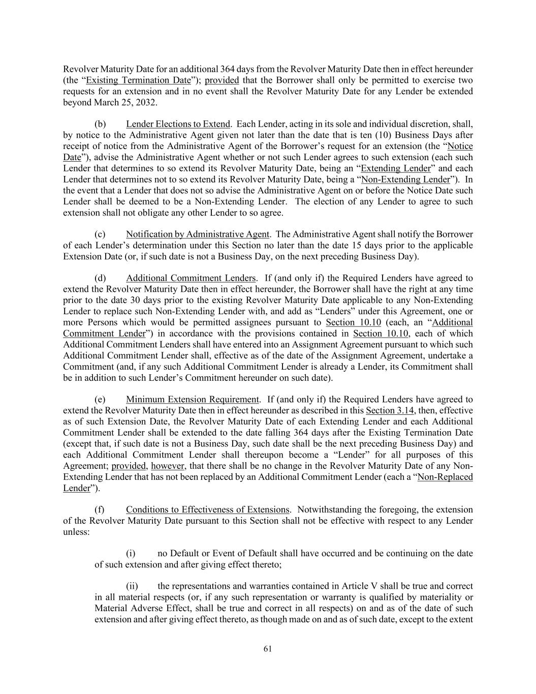 61 Revolver Maturity Date for an additional 364 days from the Revolver Maturity Date then in effect hereunder (the “Existing Termination Date”); provided that the Borrower shall only be permitted to exercise two requests for an extension and in no event shall the Revolver Maturity Date for any Lender be extended beyond March 25, 2032. (b) Lender Elections to Extend. Each Lender, acting in its sole and individual discretion, shall, by notice to the Administrative Agent given not later than the date that is ten (10) Business Days after receipt of notice from the Administrative Agent of the Borrower’s request for an extension (the “Notice Date”), advise the Administrative Agent whether or not such Lender agrees to such extension (each such Lender that determines to so extend its Revolver Maturity Date, being an “Extending Lender” and each Lender that determines not to so extend its Revolver Maturity Date, being a “Non-Extending Lender”). In the event that a Lender that does not so advise the Administrative Agent on or before the Notice Date such Lender shall be deemed to be a Non-Extending Lender. The election of any Lender to agree to such extension shall not obligate any other Lender to so agree. (c) Notification by Administrative Agent. The Administrative Agent shall notify the Borrower of each Lender’s determination under this Section no later than the date 15 days prior to the applicable Extension Date (or, if such date is not a Business Day, on the next preceding Business Day). (d) Additional Commitment Lenders. If (and only if) the Required Lenders have agreed to extend the Revolver Maturity Date then in effect hereunder, the Borrower shall have the right at any time prior to the date 30 days prior to the existing Revolver Maturity Date applicable to any Non-Extending Lender to replace such Non-Extending Lender with, and add as “Lenders” under this Agreement, one or more Persons which would be permitted assignees pursuant to Section 10.10 (each, an “Additional Commitment Lender”) in accordance with the provisions contained in Section 10.10, each of which Additional Commitment Lenders shall have entered into an Assignment Agreement pursuant to which such Additional Commitment Lender shall, effective as of the date of the Assignment Agreement, undertake a Commitment (and, if any such Additional Commitment Lender is already a Lender, its Commitment shall be in addition to such Lender’s Commitment hereunder on such date). (e) Minimum Extension Requirement. If (and only if) the Required Lenders have agreed to extend the Revolver Maturity Date then in effect hereunder as described in this Section 3.14, then, effective as of such Extension Date, the Revolver Maturity Date of each Extending Lender and each Additional Commitment Lender shall be extended to the date falling 364 days after the Existing Termination Date (except that, if such date is not a Business Day, such date shall be the next preceding Business Day) and each Additional Commitment Lender shall thereupon become a “Lender” for all purposes of this Agreement; provided, however, that there shall be no change in the Revolver Maturity Date of any Non- Extending Lender that has not been replaced by an Additional Commitment Lender (each a “Non-Replaced Lender”). (f) Conditions to Effectiveness of Extensions. Notwithstanding the foregoing, the extension of the Revolver Maturity Date pursuant to this Section shall not be effective with respect to any Lender unless: (i) no Default or Event of Default shall have occurred and be continuing on the date of such extension and after giving effect thereto; (ii) the representations and warranties contained in Article V shall be true and correct in all material respects (or, if any such representation or warranty is qualified by materiality or Material Adverse Effect, shall be true and correct in all respects) on and as of the date of such extension and after giving effect thereto, as though made on and as of such date, except to the extent