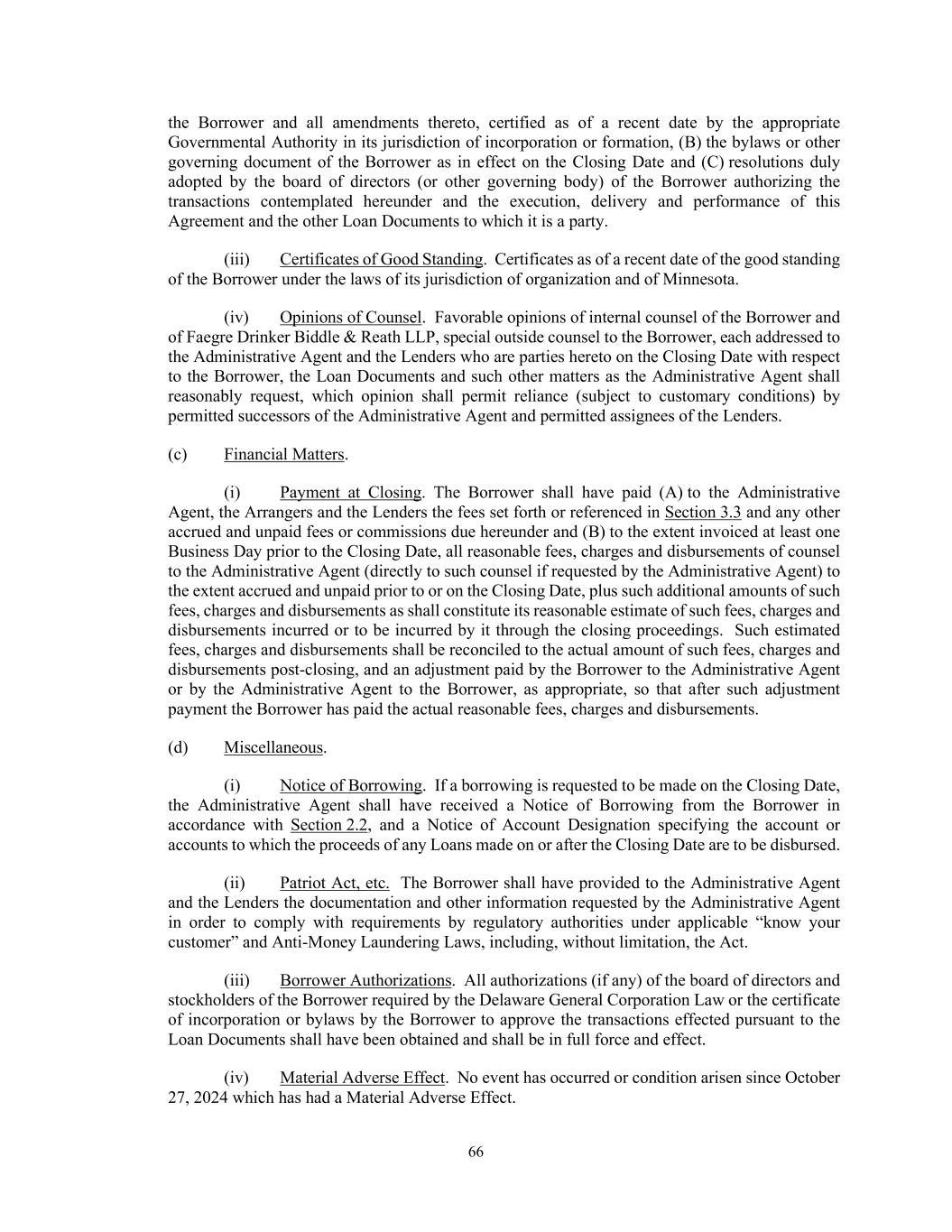 66 the Borrower and all amendments thereto, certified as of a recent date by the appropriate Governmental Authority in its jurisdiction of incorporation or formation, (B) the bylaws or other governing document of the Borrower as in effect on the Closing Date and (C) resolutions duly adopted by the board of directors (or other governing body) of the Borrower authorizing the transactions contemplated hereunder and the execution, delivery and performance of this Agreement and the other Loan Documents to which it is a party. (iii) Certificates of Good Standing. Certificates as of a recent date of the good standing of the Borrower under the laws of its jurisdiction of organization and of Minnesota. (iv) Opinions of Counsel. Favorable opinions of internal counsel of the Borrower and of Faegre Drinker Biddle & Reath LLP, special outside counsel to the Borrower, each addressed to the Administrative Agent and the Lenders who are parties hereto on the Closing Date with respect to the Borrower, the Loan Documents and such other matters as the Administrative Agent shall reasonably request, which opinion shall permit reliance (subject to customary conditions) by permitted successors of the Administrative Agent and permitted assignees of the Lenders. (c) Financial Matters. (i) Payment at Closing. The Borrower shall have paid (A) to the Administrative Agent, the Arrangers and the Lenders the fees set forth or referenced in Section 3.3 and any other accrued and unpaid fees or commissions due hereunder and (B) to the extent invoiced at least one Business Day prior to the Closing Date, all reasonable fees, charges and disbursements of counsel to the Administrative Agent (directly to such counsel if requested by the Administrative Agent) to the extent accrued and unpaid prior to or on the Closing Date, plus such additional amounts of such fees, charges and disbursements as shall constitute its reasonable estimate of such fees, charges and disbursements incurred or to be incurred by it through the closing proceedings. Such estimated fees, charges and disbursements shall be reconciled to the actual amount of such fees, charges and disbursements post-closing, and an adjustment paid by the Borrower to the Administrative Agent or by the Administrative Agent to the Borrower, as appropriate, so that after such adjustment payment the Borrower has paid the actual reasonable fees, charges and disbursements. (d) Miscellaneous. (i) Notice of Borrowing. If a borrowing is requested to be made on the Closing Date, the Administrative Agent shall have received a Notice of Borrowing from the Borrower in accordance with Section 2.2, and a Notice of Account Designation specifying the account or accounts to which the proceeds of any Loans made on or after the Closing Date are to be disbursed. (ii) Patriot Act, etc. The Borrower shall have provided to the Administrative Agent and the Lenders the documentation and other information requested by the Administrative Agent in order to comply with requirements by regulatory authorities under applicable “know your customer” and Anti-Money Laundering Laws, including, without limitation, the Act. (iii) Borrower Authorizations. All authorizations (if any) of the board of directors and stockholders of the Borrower required by the Delaware General Corporation Law or the certificate of incorporation or bylaws by the Borrower to approve the transactions effected pursuant to the Loan Documents shall have been obtained and shall be in full force and effect. (iv) Material Adverse Effect. No event has occurred or condition arisen since October 27, 2024 which has had a Material Adverse Effect.