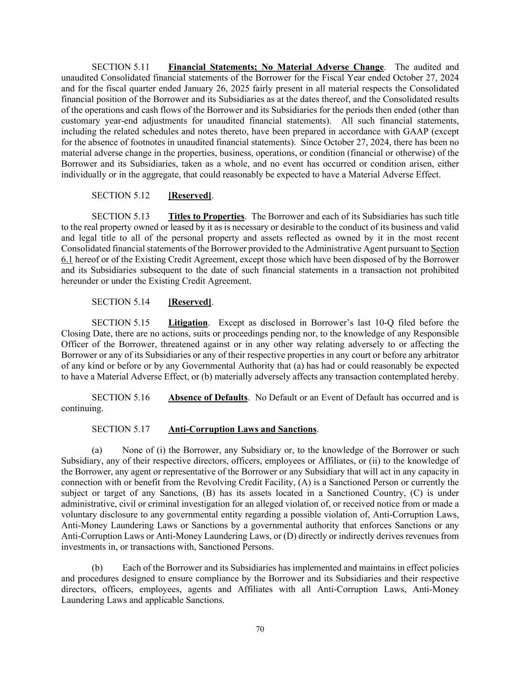70 SECTION 5.11 Financial Statements; No Material Adverse Change. The audited and unaudited Consolidated financial statements of the Borrower for the Fiscal Year ended October 27, 2024 and for the fiscal quarter ended January 26, 2025 fairly present in all material respects the Consolidated financial position of the Borrower and its Subsidiaries as at the dates thereof, and the Consolidated results of the operations and cash flows of the Borrower and its Subsidiaries for the periods then ended (other than customary year-end adjustments for unaudited financial statements). All such financial statements, including the related schedules and notes thereto, have been prepared in accordance with GAAP (except for the absence of footnotes in unaudited financial statements). Since October 27, 2024, there has been no material adverse change in the properties, business, operations, or condition (financial or otherwise) of the Borrower and its Subsidiaries, taken as a whole, and no event has occurred or condition arisen, either individually or in the aggregate, that could reasonably be expected to have a Material Adverse Effect. SECTION 5.12 [Reserved]. SECTION 5.13 Titles to Properties. The Borrower and each of its Subsidiaries has such title to the real property owned or leased by it as is necessary or desirable to the conduct of its business and valid and legal title to all of the personal property and assets reflected as owned by it in the most recent Consolidated financial statements of the Borrower provided to the Administrative Agent pursuant to Section 6.1 hereof or of the Existing Credit Agreement, except those which have been disposed of by the Borrower and its Subsidiaries subsequent to the date of such financial statements in a transaction not prohibited hereunder or under the Existing Credit Agreement. SECTION 5.14 [Reserved]. SECTION 5.15 Litigation. Except as disclosed in Borrower’s last 10-Q filed before the Closing Date, there are no actions, suits or proceedings pending nor, to the knowledge of any Responsible Officer of the Borrower, threatened against or in any other way relating adversely to or affecting the Borrower or any of its Subsidiaries or any of their respective properties in any court or before any arbitrator of any kind or before or by any Governmental Authority that (a) has had or could reasonably be expected to have a Material Adverse Effect, or (b) materially adversely affects any transaction contemplated hereby. SECTION 5.16 Absence of Defaults. No Default or an Event of Default has occurred and is continuing. SECTION 5.17 Anti-Corruption Laws and Sanctions. (a) None of (i) the Borrower, any Subsidiary or, to the knowledge of the Borrower or such Subsidiary, any of their respective directors, officers, employees or Affiliates, or (ii) to the knowledge of the Borrower, any agent or representative of the Borrower or any Subsidiary that will act in any capacity in connection with or benefit from the Revolving Credit Facility, (A) is a Sanctioned Person or currently the subject or target of any Sanctions, (B) has its assets located in a Sanctioned Country, (C) is under administrative, civil or criminal investigation for an alleged violation of, or received notice from or made a voluntary disclosure to any governmental entity regarding a possible violation of, Anti-Corruption Laws, Anti-Money Laundering Laws or Sanctions by a governmental authority that enforces Sanctions or any Anti-Corruption Laws or Anti-Money Laundering Laws, or (D) directly or indirectly derives revenues from investments in, or transactions with, Sanctioned Persons. (b) Each of the Borrower and its Subsidiaries has implemented and maintains in effect policies and procedures designed to ensure compliance by the Borrower and its Subsidiaries and their respective directors, officers, employees, agents and Affiliates with all Anti-Corruption Laws, Anti-Money Laundering Laws and applicable Sanctions.