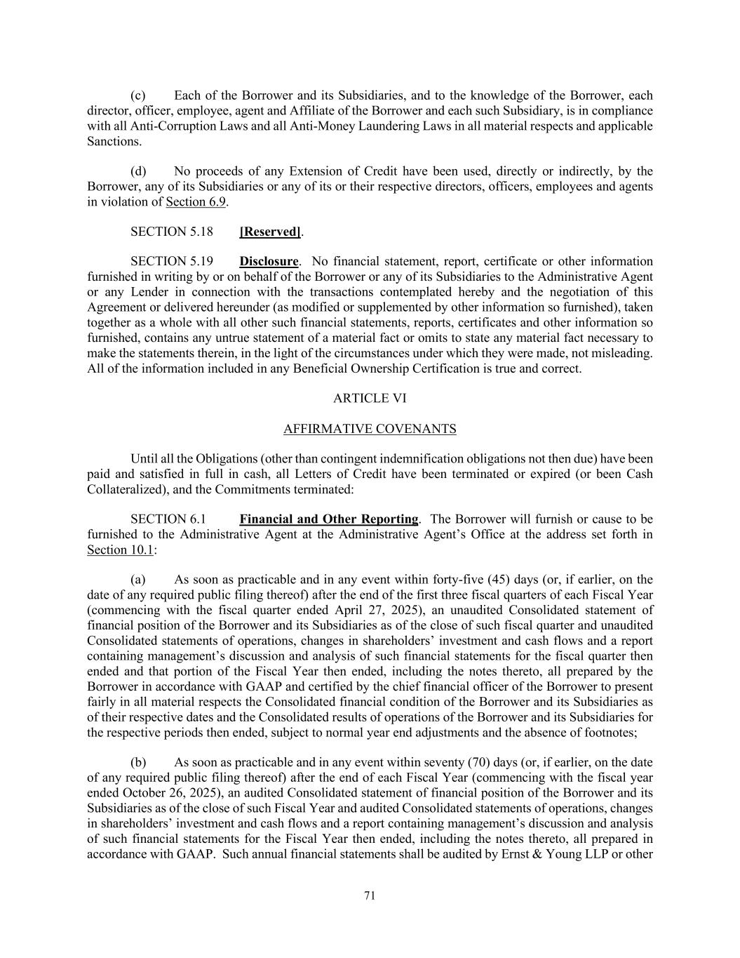 71 (c) Each of the Borrower and its Subsidiaries, and to the knowledge of the Borrower, each director, officer, employee, agent and Affiliate of the Borrower and each such Subsidiary, is in compliance with all Anti-Corruption Laws and all Anti-Money Laundering Laws in all material respects and applicable Sanctions. (d) No proceeds of any Extension of Credit have been used, directly or indirectly, by the Borrower, any of its Subsidiaries or any of its or their respective directors, officers, employees and agents in violation of Section 6.9. SECTION 5.18 [Reserved]. SECTION 5.19 Disclosure. No financial statement, report, certificate or other information furnished in writing by or on behalf of the Borrower or any of its Subsidiaries to the Administrative Agent or any Lender in connection with the transactions contemplated hereby and the negotiation of this Agreement or delivered hereunder (as modified or supplemented by other information so furnished), taken together as a whole with all other such financial statements, reports, certificates and other information so furnished, contains any untrue statement of a material fact or omits to state any material fact necessary to make the statements therein, in the light of the circumstances under which they were made, not misleading. All of the information included in any Beneficial Ownership Certification is true and correct. ARTICLE VI AFFIRMATIVE COVENANTS Until all the Obligations (other than contingent indemnification obligations not then due) have been paid and satisfied in full in cash, all Letters of Credit have been terminated or expired (or been Cash Collateralized), and the Commitments terminated: SECTION 6.1 Financial and Other Reporting. The Borrower will furnish or cause to be furnished to the Administrative Agent at the Administrative Agent’s Office at the address set forth in Section 10.1: (a) As soon as practicable and in any event within forty-five (45) days (or, if earlier, on the date of any required public filing thereof) after the end of the first three fiscal quarters of each Fiscal Year (commencing with the fiscal quarter ended April 27, 2025), an unaudited Consolidated statement of financial position of the Borrower and its Subsidiaries as of the close of such fiscal quarter and unaudited Consolidated statements of operations, changes in shareholders’ investment and cash flows and a report containing management’s discussion and analysis of such financial statements for the fiscal quarter then ended and that portion of the Fiscal Year then ended, including the notes thereto, all prepared by the Borrower in accordance with GAAP and certified by the chief financial officer of the Borrower to present fairly in all material respects the Consolidated financial condition of the Borrower and its Subsidiaries as of their respective dates and the Consolidated results of operations of the Borrower and its Subsidiaries for the respective periods then ended, subject to normal year end adjustments and the absence of footnotes; (b) As soon as practicable and in any event within seventy (70) days (or, if earlier, on the date of any required public filing thereof) after the end of each Fiscal Year (commencing with the fiscal year ended October 26, 2025), an audited Consolidated statement of financial position of the Borrower and its Subsidiaries as of the close of such Fiscal Year and audited Consolidated statements of operations, changes in shareholders’ investment and cash flows and a report containing management’s discussion and analysis of such financial statements for the Fiscal Year then ended, including the notes thereto, all prepared in accordance with GAAP. Such annual financial statements shall be audited by Ernst & Young LLP or other