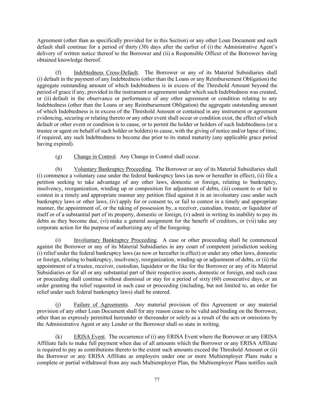 77 Agreement (other than as specifically provided for in this Section) or any other Loan Document and such default shall continue for a period of thirty (30) days after the earlier of (i) the Administrative Agent’s delivery of written notice thereof to the Borrower and (ii) a Responsible Officer of the Borrower having obtained knowledge thereof. (f) Indebtedness Cross-Default. The Borrower or any of its Material Subsidiaries shall (i) default in the payment of any Indebtedness (other than the Loans or any Reimbursement Obligation) the aggregate outstanding amount of which Indebtedness is in excess of the Threshold Amount beyond the period of grace if any, provided in the instrument or agreement under which such Indebtedness was created, or (ii) default in the observance or performance of any other agreement or condition relating to any Indebtedness (other than the Loans or any Reimbursement Obligation) the aggregate outstanding amount of which Indebtedness is in excess of the Threshold Amount or contained in any instrument or agreement evidencing, securing or relating thereto or any other event shall occur or condition exist, the effect of which default or other event or condition is to cause, or to permit the holder or holders of such Indebtedness (or a trustee or agent on behalf of such holder or holders) to cause, with the giving of notice and/or lapse of time, if required, any such Indebtedness to become due prior to its stated maturity (any applicable grace period having expired). (g) Change in Control. Any Change in Control shall occur. (h) Voluntary Bankruptcy Proceeding. The Borrower or any of its Material Subsidiaries shall (i) commence a voluntary case under the federal bankruptcy laws (as now or hereafter in effect), (ii) file a petition seeking to take advantage of any other laws, domestic or foreign, relating to bankruptcy, insolvency, reorganization, winding up or composition for adjustment of debts, (iii) consent to or fail to contest in a timely and appropriate manner any petition filed against it in an involuntary case under such bankruptcy laws or other laws, (iv) apply for or consent to, or fail to contest in a timely and appropriate manner, the appointment of, or the taking of possession by, a receiver, custodian, trustee, or liquidator of itself or of a substantial part of its property, domestic or foreign, (v) admit in writing its inability to pay its debts as they become due, (vi) make a general assignment for the benefit of creditors, or (vii) take any corporate action for the purpose of authorizing any of the foregoing. (i) Involuntary Bankruptcy Proceeding. A case or other proceeding shall be commenced against the Borrower or any of its Material Subsidiaries in any court of competent jurisdiction seeking (i) relief under the federal bankruptcy laws (as now or hereafter in effect) or under any other laws, domestic or foreign, relating to bankruptcy, insolvency, reorganization, winding up or adjustment of debts, or (ii) the appointment of a trustee, receiver, custodian, liquidator or the like for the Borrower or any of its Material Subsidiaries or for all or any substantial part of their respective assets, domestic or foreign, and such case or proceeding shall continue without dismissal or stay for a period of sixty (60) consecutive days, or an order granting the relief requested in such case or proceeding (including, but not limited to, an order for relief under such federal bankruptcy laws) shall be entered. (j) Failure of Agreements. Any material provision of this Agreement or any material provision of any other Loan Document shall for any reason cease to be valid and binding on the Borrower, other than as expressly permitted hereunder or thereunder or solely as a result of the acts or omissions by the Administrative Agent or any Lender or the Borrower shall so state in writing. (k) ERISA Event. The occurrence of (i) any ERISA Event where the Borrower or any ERISA Affiliate fails to make full payment when due of all amounts which the Borrower or any ERISA Affiliate is required to pay as contributions thereto to the extent such amounts exceed the Threshold Amount or (ii) the Borrower or any ERISA Affiliate as employers under one or more Multiemployer Plans make a complete or partial withdrawal from any such Multiemployer Plan, the Multiemployer Plans notifies such