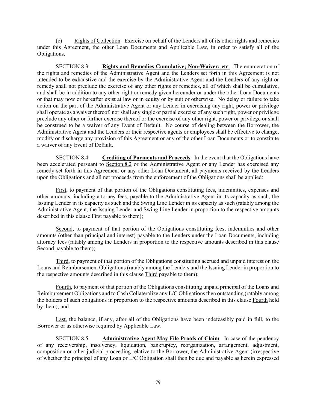 79 (c) Rights of Collection. Exercise on behalf of the Lenders all of its other rights and remedies under this Agreement, the other Loan Documents and Applicable Law, in order to satisfy all of the Obligations. SECTION 8.3 Rights and Remedies Cumulative; Non-Waiver; etc. The enumeration of the rights and remedies of the Administrative Agent and the Lenders set forth in this Agreement is not intended to be exhaustive and the exercise by the Administrative Agent and the Lenders of any right or remedy shall not preclude the exercise of any other rights or remedies, all of which shall be cumulative, and shall be in addition to any other right or remedy given hereunder or under the other Loan Documents or that may now or hereafter exist at law or in equity or by suit or otherwise. No delay or failure to take action on the part of the Administrative Agent or any Lender in exercising any right, power or privilege shall operate as a waiver thereof, nor shall any single or partial exercise of any such right, power or privilege preclude any other or further exercise thereof or the exercise of any other right, power or privilege or shall be construed to be a waiver of any Event of Default. No course of dealing between the Borrower, the Administrative Agent and the Lenders or their respective agents or employees shall be effective to change, modify or discharge any provision of this Agreement or any of the other Loan Documents or to constitute a waiver of any Event of Default. SECTION 8.4 Crediting of Payments and Proceeds. In the event that the Obligations have been accelerated pursuant to Section 8.2 or the Administrative Agent or any Lender has exercised any remedy set forth in this Agreement or any other Loan Document, all payments received by the Lenders upon the Obligations and all net proceeds from the enforcement of the Obligations shall be applied: First, to payment of that portion of the Obligations constituting fees, indemnities, expenses and other amounts, including attorney fees, payable to the Administrative Agent in its capacity as such, the Issuing Lender in its capacity as such and the Swing Line Lender in its capacity as such (ratably among the Administrative Agent, the Issuing Lender and Swing Line Lender in proportion to the respective amounts described in this clause First payable to them); Second, to payment of that portion of the Obligations constituting fees, indemnities and other amounts (other than principal and interest) payable to the Lenders under the Loan Documents, including attorney fees (ratably among the Lenders in proportion to the respective amounts described in this clause Second payable to them); Third, to payment of that portion of the Obligations constituting accrued and unpaid interest on the Loans and Reimbursement Obligations (ratably among the Lenders and the Issuing Lender in proportion to the respective amounts described in this clause Third payable to them); Fourth, to payment of that portion of the Obligations constituting unpaid principal of the Loans and Reimbursement Obligations and to Cash Collateralize any L/C Obligations then outstanding (ratably among the holders of such obligations in proportion to the respective amounts described in this clause Fourth held by them); and Last, the balance, if any, after all of the Obligations have been indefeasibly paid in full, to the Borrower or as otherwise required by Applicable Law. SECTION 8.5 Administrative Agent May File Proofs of Claim. In case of the pendency of any receivership, insolvency, liquidation, bankruptcy, reorganization, arrangement, adjustment, composition or other judicial proceeding relative to the Borrower, the Administrative Agent (irrespective of whether the principal of any Loan or L/C Obligation shall then be due and payable as herein expressed