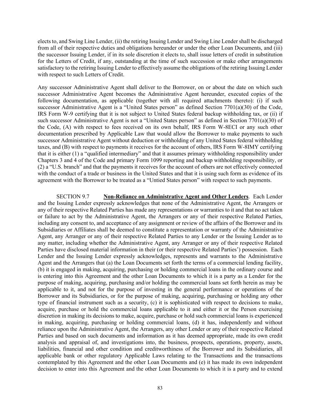 83 elects to, and Swing Line Lender, (ii) the retiring Issuing Lender and Swing Line Lender shall be discharged from all of their respective duties and obligations hereunder or under the other Loan Documents, and (iii) the successor Issuing Lender, if in its sole discretion it elects to, shall issue letters of credit in substitution for the Letters of Credit, if any, outstanding at the time of such succession or make other arrangements satisfactory to the retiring Issuing Lender to effectively assume the obligations of the retiring Issuing Lender with respect to such Letters of Credit. Any successor Administrative Agent shall deliver to the Borrower, on or about the date on which such successor Administrative Agent becomes the Administrative Agent hereunder, executed copies of the following documentation, as applicable (together with all required attachments thereto): (i) if such successor Administrative Agent is a “United States person” as defined Section 7701(a)(30) of the Code, IRS Form W-9 certifying that it is not subject to United States federal backup withholding tax, or (ii) if such successor Administrative Agent is not a “United States person” as defined in Section 7701(a)(30) of the Code, (A) with respect to fees received on its own behalf, IRS Form W-8ECI or any such other documentation prescribed by Applicable Law that would allow the Borrower to make payments to such successor Administrative Agent without deduction or withholding of any United States federal withholding taxes, and (B) with respect to payments it receives for the account of others, IRS Form W-8IMY certifying that it is either (1) a “qualified intermediary” and that it assumes primary withholding responsibility under Chapters 3 and 4 of the Code and primary Form 1099 reporting and backup withholding responsibility, or (2) a “U.S. branch” and that the payments it receives for the account of others are not effectively connected with the conduct of a trade or business in the United States and that it is using such form as evidence of its agreement with the Borrower to be treated as a “Untied States person” with respect to such payments. SECTION 9.7 Non-Reliance on Administrative Agent and Other Lenders. Each Lender and the Issuing Lender expressly acknowledges that none of the Administrative Agent, the Arrangers or any of their respective Related Parties has made any representations or warranties to it and that no act taken or failure to act by the Administrative Agent, the Arrangers or any of their respective Related Parties, including any consent to, and acceptance of any assignment or review of the affairs of the Borrower and its Subsidiaries or Affiliates shall be deemed to constitute a representation or warranty of the Administrative Agent, any Arranger or any of their respective Related Parties to any Lender or the Issuing Lender as to any matter, including whether the Administrative Agent, any Arranger or any of their respective Related Parties have disclosed material information in their (or their respective Related Parties’) possession. Each Lender and the Issuing Lender expressly acknowledges, represents and warrants to the Administrative Agent and the Arrangers that (a) the Loan Documents set forth the terms of a commercial lending facility, (b) it is engaged in making, acquiring, purchasing or holding commercial loans in the ordinary course and is entering into this Agreement and the other Loan Documents to which it is a party as a Lender for the purpose of making, acquiring, purchasing and/or holding the commercial loans set forth herein as may be applicable to it, and not for the purpose of investing in the general performance or operations of the Borrower and its Subsidiaries, or for the purpose of making, acquiring, purchasing or holding any other type of financial instrument such as a security, (c) it is sophisticated with respect to decisions to make, acquire, purchase or hold the commercial loans applicable to it and either it or the Person exercising discretion in making its decisions to make, acquire, purchase or hold such commercial loans is experienced in making, acquiring, purchasing or holding commercial loans, (d) it has, independently and without reliance upon the Administrative Agent, the Arrangers, any other Lender or any of their respective Related Parties and based on such documents and information as it has deemed appropriate, made its own credit analysis and appraisal of, and investigations into, the business, prospects, operations, property, assets, liabilities, financial and other condition and creditworthiness of the Borrower and its Subsidiaries, all applicable bank or other regulatory Applicable Laws relating to the Transactions and the transactions contemplated by this Agreement and the other Loan Documents and (e) it has made its own independent decision to enter into this Agreement and the other Loan Documents to which it is a party and to extend
