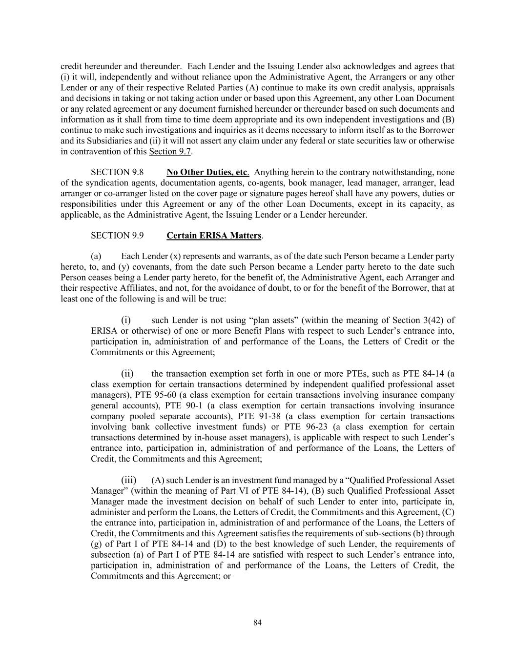 84 credit hereunder and thereunder. Each Lender and the Issuing Lender also acknowledges and agrees that (i) it will, independently and without reliance upon the Administrative Agent, the Arrangers or any other Lender or any of their respective Related Parties (A) continue to make its own credit analysis, appraisals and decisions in taking or not taking action under or based upon this Agreement, any other Loan Document or any related agreement or any document furnished hereunder or thereunder based on such documents and information as it shall from time to time deem appropriate and its own independent investigations and (B) continue to make such investigations and inquiries as it deems necessary to inform itself as to the Borrower and its Subsidiaries and (ii) it will not assert any claim under any federal or state securities law or otherwise in contravention of this Section 9.7. SECTION 9.8 No Other Duties, etc. Anything herein to the contrary notwithstanding, none of the syndication agents, documentation agents, co-agents, book manager, lead manager, arranger, lead arranger or co-arranger listed on the cover page or signature pages hereof shall have any powers, duties or responsibilities under this Agreement or any of the other Loan Documents, except in its capacity, as applicable, as the Administrative Agent, the Issuing Lender or a Lender hereunder. SECTION 9.9 Certain ERISA Matters. (a) Each Lender (x) represents and warrants, as of the date such Person became a Lender party hereto, to, and (y) covenants, from the date such Person became a Lender party hereto to the date such Person ceases being a Lender party hereto, for the benefit of, the Administrative Agent, each Arranger and their respective Affiliates, and not, for the avoidance of doubt, to or for the benefit of the Borrower, that at least one of the following is and will be true: (i) such Lender is not using “plan assets” (within the meaning of Section 3(42) of ERISA or otherwise) of one or more Benefit Plans with respect to such Lender’s entrance into, participation in, administration of and performance of the Loans, the Letters of Credit or the Commitments or this Agreement; (ii) the transaction exemption set forth in one or more PTEs, such as PTE 84-14 (a class exemption for certain transactions determined by independent qualified professional asset managers), PTE 95-60 (a class exemption for certain transactions involving insurance company general accounts), PTE 90-1 (a class exemption for certain transactions involving insurance company pooled separate accounts), PTE 91-38 (a class exemption for certain transactions involving bank collective investment funds) or PTE 96-23 (a class exemption for certain transactions determined by in-house asset managers), is applicable with respect to such Lender’s entrance into, participation in, administration of and performance of the Loans, the Letters of Credit, the Commitments and this Agreement; (iii) (A) such Lender is an investment fund managed by a “Qualified Professional Asset Manager” (within the meaning of Part VI of PTE 84-14), (B) such Qualified Professional Asset Manager made the investment decision on behalf of such Lender to enter into, participate in, administer and perform the Loans, the Letters of Credit, the Commitments and this Agreement, (C) the entrance into, participation in, administration of and performance of the Loans, the Letters of Credit, the Commitments and this Agreement satisfies the requirements of sub-sections (b) through (g) of Part I of PTE 84-14 and (D) to the best knowledge of such Lender, the requirements of subsection (a) of Part I of PTE 84-14 are satisfied with respect to such Lender’s entrance into, participation in, administration of and performance of the Loans, the Letters of Credit, the Commitments and this Agreement; or