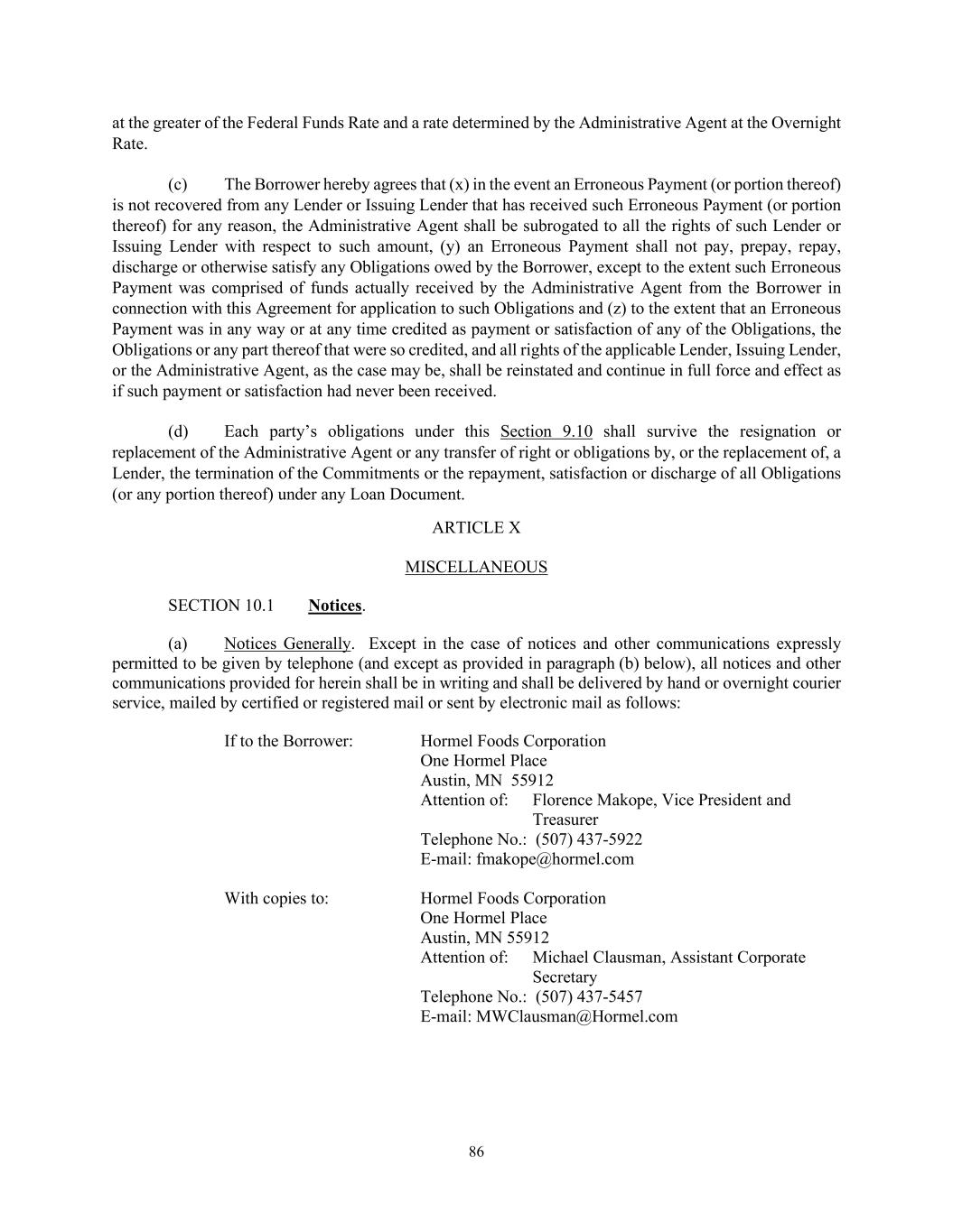 86 at the greater of the Federal Funds Rate and a rate determined by the Administrative Agent at the Overnight Rate. (c) The Borrower hereby agrees that (x) in the event an Erroneous Payment (or portion thereof) is not recovered from any Lender or Issuing Lender that has received such Erroneous Payment (or portion thereof) for any reason, the Administrative Agent shall be subrogated to all the rights of such Lender or Issuing Lender with respect to such amount, (y) an Erroneous Payment shall not pay, prepay, repay, discharge or otherwise satisfy any Obligations owed by the Borrower, except to the extent such Erroneous Payment was comprised of funds actually received by the Administrative Agent from the Borrower in connection with this Agreement for application to such Obligations and (z) to the extent that an Erroneous Payment was in any way or at any time credited as payment or satisfaction of any of the Obligations, the Obligations or any part thereof that were so credited, and all rights of the applicable Lender, Issuing Lender, or the Administrative Agent, as the case may be, shall be reinstated and continue in full force and effect as if such payment or satisfaction had never been received. (d) Each party’s obligations under this Section 9.10 shall survive the resignation or replacement of the Administrative Agent or any transfer of right or obligations by, or the replacement of, a Lender, the termination of the Commitments or the repayment, satisfaction or discharge of all Obligations (or any portion thereof) under any Loan Document. ARTICLE X MISCELLANEOUS SECTION 10.1 Notices. (a) Notices Generally. Except in the case of notices and other communications expressly permitted to be given by telephone (and except as provided in paragraph (b) below), all notices and other communications provided for herein shall be in writing and shall be delivered by hand or overnight courier service, mailed by certified or registered mail or sent by electronic mail as follows: If to the Borrower: Hormel Foods Corporation One Hormel Place Austin, MN 55912 Attention of: Florence Makope, Vice President and Treasurer Telephone No.: (507) 437-5922 E-mail: fmakope@hormel.com With copies to: Hormel Foods Corporation One Hormel Place Austin, MN 55912 Attention of: Michael Clausman, Assistant Corporate Secretary Telephone No.: (507) 437-5457 E-mail: MWClausman@Hormel.com