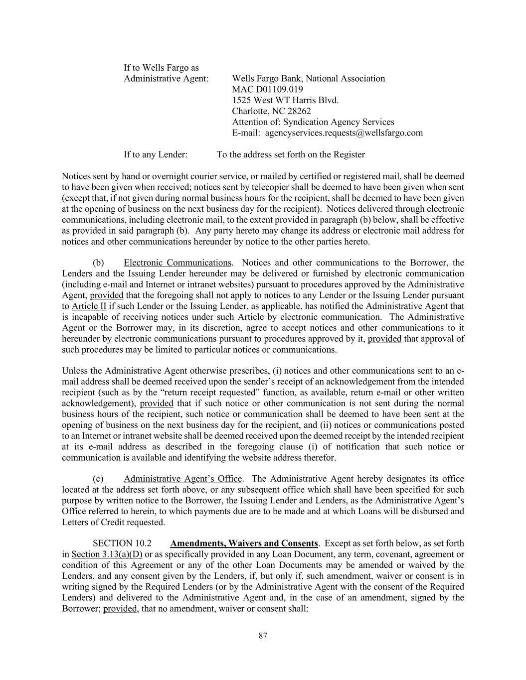 87 If to Wells Fargo as Administrative Agent: Wells Fargo Bank, National Association MAC D01109.019 1525 West WT Harris Blvd. Charlotte, NC 28262 Attention of: Syndication Agency Services E-mail: agencyservices.requests@wellsfargo.com If to any Lender: To the address set forth on the Register Notices sent by hand or overnight courier service, or mailed by certified or registered mail, shall be deemed to have been given when received; notices sent by telecopier shall be deemed to have been given when sent (except that, if not given during normal business hours for the recipient, shall be deemed to have been given at the opening of business on the next business day for the recipient). Notices delivered through electronic communications, including electronic mail, to the extent provided in paragraph (b) below, shall be effective as provided in said paragraph (b). Any party hereto may change its address or electronic mail address for notices and other communications hereunder by notice to the other parties hereto. (b) Electronic Communications. Notices and other communications to the Borrower, the Lenders and the Issuing Lender hereunder may be delivered or furnished by electronic communication (including e-mail and Internet or intranet websites) pursuant to procedures approved by the Administrative Agent, provided that the foregoing shall not apply to notices to any Lender or the Issuing Lender pursuant to Article II if such Lender or the Issuing Lender, as applicable, has notified the Administrative Agent that is incapable of receiving notices under such Article by electronic communication. The Administrative Agent or the Borrower may, in its discretion, agree to accept notices and other communications to it hereunder by electronic communications pursuant to procedures approved by it, provided that approval of such procedures may be limited to particular notices or communications. Unless the Administrative Agent otherwise prescribes, (i) notices and other communications sent to an e- mail address shall be deemed received upon the sender’s receipt of an acknowledgement from the intended recipient (such as by the “return receipt requested” function, as available, return e-mail or other written acknowledgement), provided that if such notice or other communication is not sent during the normal business hours of the recipient, such notice or communication shall be deemed to have been sent at the opening of business on the next business day for the recipient, and (ii) notices or communications posted to an Internet or intranet website shall be deemed received upon the deemed receipt by the intended recipient at its e-mail address as described in the foregoing clause (i) of notification that such notice or communication is available and identifying the website address therefor. (c) Administrative Agent’s Office. The Administrative Agent hereby designates its office located at the address set forth above, or any subsequent office which shall have been specified for such purpose by written notice to the Borrower, the Issuing Lender and Lenders, as the Administrative Agent’s Office referred to herein, to which payments due are to be made and at which Loans will be disbursed and Letters of Credit requested. SECTION 10.2 Amendments, Waivers and Consents. Except as set forth below, as set forth in Section 3.13(a)(D) or as specifically provided in any Loan Document, any term, covenant, agreement or condition of this Agreement or any of the other Loan Documents may be amended or waived by the Lenders, and any consent given by the Lenders, if, but only if, such amendment, waiver or consent is in writing signed by the Required Lenders (or by the Administrative Agent with the consent of the Required Lenders) and delivered to the Administrative Agent and, in the case of an amendment, signed by the Borrower; provided, that no amendment, waiver or consent shall: