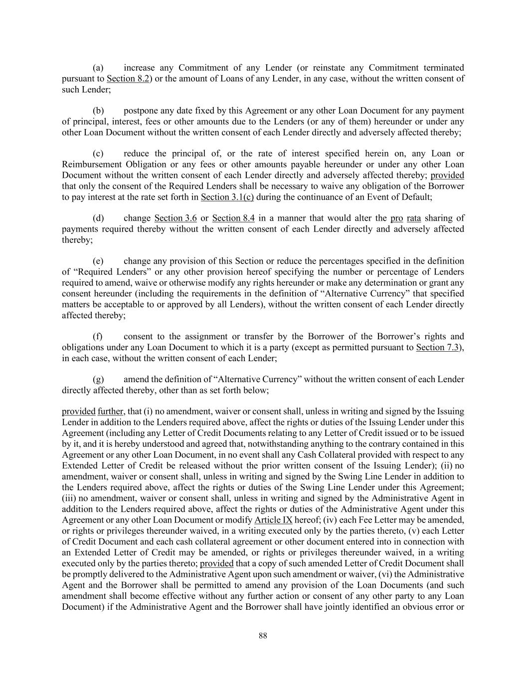 88 (a) increase any Commitment of any Lender (or reinstate any Commitment terminated pursuant to Section 8.2) or the amount of Loans of any Lender, in any case, without the written consent of such Lender; (b) postpone any date fixed by this Agreement or any other Loan Document for any payment of principal, interest, fees or other amounts due to the Lenders (or any of them) hereunder or under any other Loan Document without the written consent of each Lender directly and adversely affected thereby; (c) reduce the principal of, or the rate of interest specified herein on, any Loan or Reimbursement Obligation or any fees or other amounts payable hereunder or under any other Loan Document without the written consent of each Lender directly and adversely affected thereby; provided that only the consent of the Required Lenders shall be necessary to waive any obligation of the Borrower to pay interest at the rate set forth in Section 3.1(c) during the continuance of an Event of Default; (d) change Section 3.6 or Section 8.4 in a manner that would alter the pro rata sharing of payments required thereby without the written consent of each Lender directly and adversely affected thereby; (e) change any provision of this Section or reduce the percentages specified in the definition of “Required Lenders” or any other provision hereof specifying the number or percentage of Lenders required to amend, waive or otherwise modify any rights hereunder or make any determination or grant any consent hereunder (including the requirements in the definition of “Alternative Currency” that specified matters be acceptable to or approved by all Lenders), without the written consent of each Lender directly affected thereby; (f) consent to the assignment or transfer by the Borrower of the Borrower’s rights and obligations under any Loan Document to which it is a party (except as permitted pursuant to Section 7.3), in each case, without the written consent of each Lender; (g) amend the definition of “Alternative Currency” without the written consent of each Lender directly affected thereby, other than as set forth below; provided further, that (i) no amendment, waiver or consent shall, unless in writing and signed by the Issuing Lender in addition to the Lenders required above, affect the rights or duties of the Issuing Lender under this Agreement (including any Letter of Credit Documents relating to any Letter of Credit issued or to be issued by it, and it is hereby understood and agreed that, notwithstanding anything to the contrary contained in this Agreement or any other Loan Document, in no event shall any Cash Collateral provided with respect to any Extended Letter of Credit be released without the prior written consent of the Issuing Lender); (ii) no amendment, waiver or consent shall, unless in writing and signed by the Swing Line Lender in addition to the Lenders required above, affect the rights or duties of the Swing Line Lender under this Agreement; (iii) no amendment, waiver or consent shall, unless in writing and signed by the Administrative Agent in addition to the Lenders required above, affect the rights or duties of the Administrative Agent under this Agreement or any other Loan Document or modify Article IX hereof; (iv) each Fee Letter may be amended, or rights or privileges thereunder waived, in a writing executed only by the parties thereto, (v) each Letter of Credit Document and each cash collateral agreement or other document entered into in connection with an Extended Letter of Credit may be amended, or rights or privileges thereunder waived, in a writing executed only by the parties thereto; provided that a copy of such amended Letter of Credit Document shall be promptly delivered to the Administrative Agent upon such amendment or waiver, (vi) the Administrative Agent and the Borrower shall be permitted to amend any provision of the Loan Documents (and such amendment shall become effective without any further action or consent of any other party to any Loan Document) if the Administrative Agent and the Borrower shall have jointly identified an obvious error or