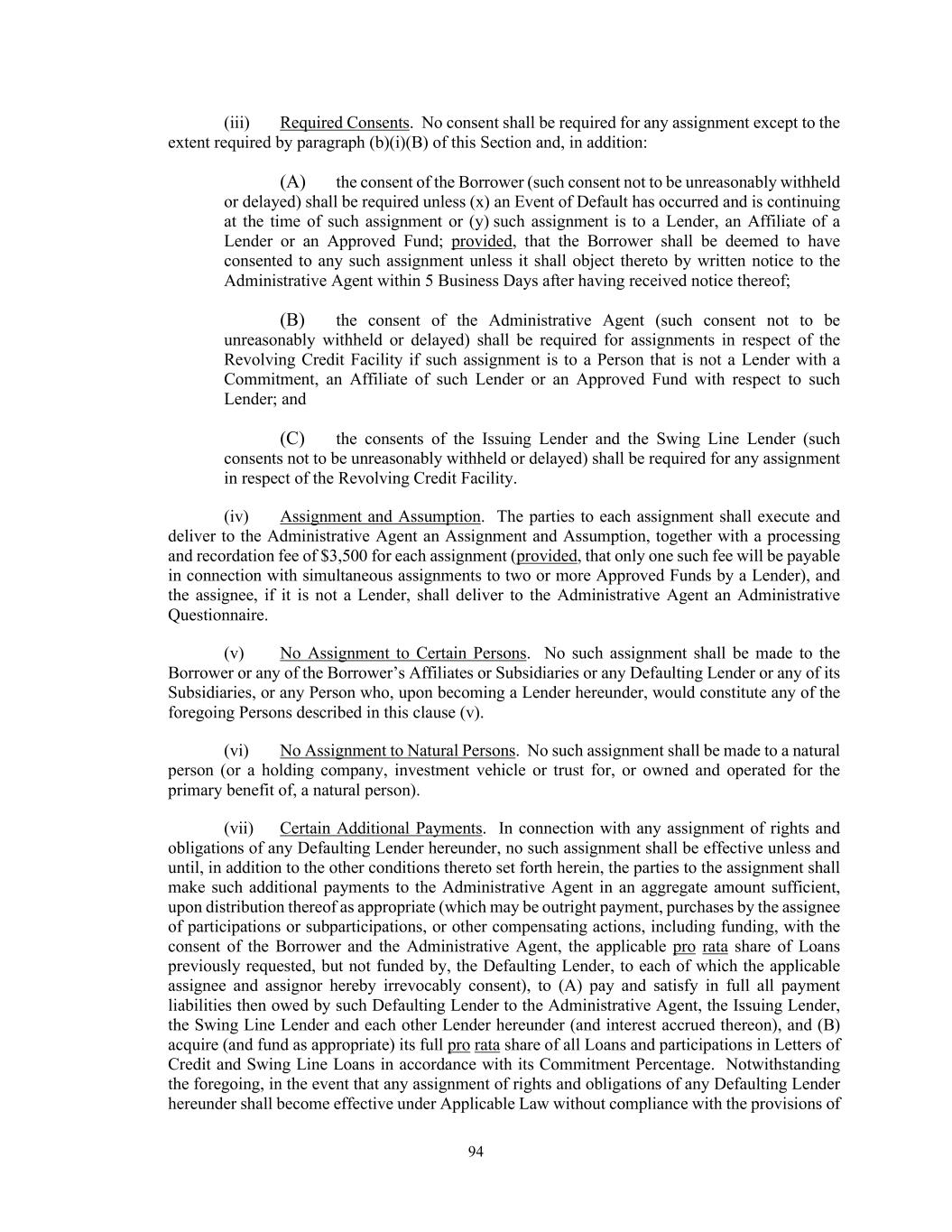 94 (iii) Required Consents. No consent shall be required for any assignment except to the extent required by paragraph (b)(i)(B) of this Section and, in addition: (A) the consent of the Borrower (such consent not to be unreasonably withheld or delayed) shall be required unless (x) an Event of Default has occurred and is continuing at the time of such assignment or (y) such assignment is to a Lender, an Affiliate of a Lender or an Approved Fund; provided, that the Borrower shall be deemed to have consented to any such assignment unless it shall object thereto by written notice to the Administrative Agent within 5 Business Days after having received notice thereof; (B) the consent of the Administrative Agent (such consent not to be unreasonably withheld or delayed) shall be required for assignments in respect of the Revolving Credit Facility if such assignment is to a Person that is not a Lender with a Commitment, an Affiliate of such Lender or an Approved Fund with respect to such Lender; and (C) the consents of the Issuing Lender and the Swing Line Lender (such consents not to be unreasonably withheld or delayed) shall be required for any assignment in respect of the Revolving Credit Facility. (iv) Assignment and Assumption. The parties to each assignment shall execute and deliver to the Administrative Agent an Assignment and Assumption, together with a processing and recordation fee of $3,500 for each assignment (provided, that only one such fee will be payable in connection with simultaneous assignments to two or more Approved Funds by a Lender), and the assignee, if it is not a Lender, shall deliver to the Administrative Agent an Administrative Questionnaire. (v) No Assignment to Certain Persons. No such assignment shall be made to the Borrower or any of the Borrower’s Affiliates or Subsidiaries or any Defaulting Lender or any of its Subsidiaries, or any Person who, upon becoming a Lender hereunder, would constitute any of the foregoing Persons described in this clause (v). (vi) No Assignment to Natural Persons. No such assignment shall be made to a natural person (or a holding company, investment vehicle or trust for, or owned and operated for the primary benefit of, a natural person). (vii) Certain Additional Payments. In connection with any assignment of rights and obligations of any Defaulting Lender hereunder, no such assignment shall be effective unless and until, in addition to the other conditions thereto set forth herein, the parties to the assignment shall make such additional payments to the Administrative Agent in an aggregate amount sufficient, upon distribution thereof as appropriate (which may be outright payment, purchases by the assignee of participations or subparticipations, or other compensating actions, including funding, with the consent of the Borrower and the Administrative Agent, the applicable pro rata share of Loans previously requested, but not funded by, the Defaulting Lender, to each of which the applicable assignee and assignor hereby irrevocably consent), to (A) pay and satisfy in full all payment liabilities then owed by such Defaulting Lender to the Administrative Agent, the Issuing Lender, the Swing Line Lender and each other Lender hereunder (and interest accrued thereon), and (B) acquire (and fund as appropriate) its full pro rata share of all Loans and participations in Letters of Credit and Swing Line Loans in accordance with its Commitment Percentage. Notwithstanding the foregoing, in the event that any assignment of rights and obligations of any Defaulting Lender hereunder shall become effective under Applicable Law without compliance with the provisions of