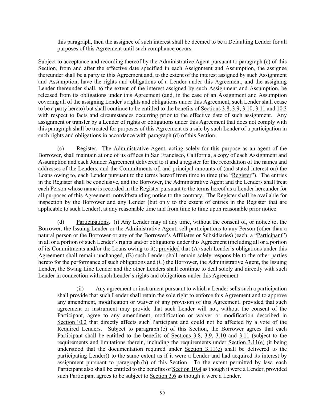 95 this paragraph, then the assignee of such interest shall be deemed to be a Defaulting Lender for all purposes of this Agreement until such compliance occurs. Subject to acceptance and recording thereof by the Administrative Agent pursuant to paragraph (c) of this Section, from and after the effective date specified in each Assignment and Assumption, the assignee thereunder shall be a party to this Agreement and, to the extent of the interest assigned by such Assignment and Assumption, have the rights and obligations of a Lender under this Agreement, and the assigning Lender thereunder shall, to the extent of the interest assigned by such Assignment and Assumption, be released from its obligations under this Agreement (and, in the case of an Assignment and Assumption covering all of the assigning Lender’s rights and obligations under this Agreement, such Lender shall cease to be a party hereto) but shall continue to be entitled to the benefits of Sections 3.8, 3.9, 3.10, 3.11 and 10.3 with respect to facts and circumstances occurring prior to the effective date of such assignment. Any assignment or transfer by a Lender of rights or obligations under this Agreement that does not comply with this paragraph shall be treated for purposes of this Agreement as a sale by such Lender of a participation in such rights and obligations in accordance with paragraph (d) of this Section. (c) Register. The Administrative Agent, acting solely for this purpose as an agent of the Borrower, shall maintain at one of its offices in San Francisco, California, a copy of each Assignment and Assumption and each Joinder Agreement delivered to it and a register for the recordation of the names and addresses of the Lenders, and the Commitments of, and principal amounts of (and stated interest on) the Loans owing to, each Lender pursuant to the terms hereof from time to time (the “Register”). The entries in the Register shall be conclusive, and the Borrower, the Administrative Agent and the Lenders shall treat each Person whose name is recorded in the Register pursuant to the terms hereof as a Lender hereunder for all purposes of this Agreement, notwithstanding notice to the contrary. The Register shall be available for inspection by the Borrower and any Lender (but only to the extent of entries in the Register that are applicable to such Lender), at any reasonable time and from time to time upon reasonable prior notice. (d) Participations. (i) Any Lender may at any time, without the consent of, or notice to, the Borrower, the Issuing Lender or the Administrative Agent, sell participations to any Person (other than a natural person or the Borrower or any of the Borrower’s Affiliates or Subsidiaries) (each, a “Participant”) in all or a portion of such Lender’s rights and/or obligations under this Agreement (including all or a portion of its Commitments and/or the Loans owing to it); provided that (A) such Lender’s obligations under this Agreement shall remain unchanged, (B) such Lender shall remain solely responsible to the other parties hereto for the performance of such obligations and (C) the Borrower, the Administrative Agent, the Issuing Lender, the Swing Line Lender and the other Lenders shall continue to deal solely and directly with such Lender in connection with such Lender’s rights and obligations under this Agreement. (ii) Any agreement or instrument pursuant to which a Lender sells such a participation shall provide that such Lender shall retain the sole right to enforce this Agreement and to approve any amendment, modification or waiver of any provision of this Agreement; provided that such agreement or instrument may provide that such Lender will not, without the consent of the Participant, agree to any amendment, modification or waiver or modification described in Section 10.2 that directly affects such Participant and could not be affected by a vote of the Required Lenders. Subject to paragraph (e) of this Section, the Borrower agrees that each Participant shall be entitled to the benefits of Sections 3.8, 3.9, 3.10 and 3.11 (subject to the requirements and limitations therein, including the requirements under Section 3.11(e) (it being understood that the documentation required under Section 3.11(e) shall be delivered to the participating Lender)) to the same extent as if it were a Lender and had acquired its interest by assignment pursuant to paragraph (b) of this Section. To the extent permitted by law, each Participant also shall be entitled to the benefits of Section 10.4 as though it were a Lender, provided such Participant agrees to be subject to Section 3.6 as though it were a Lender.