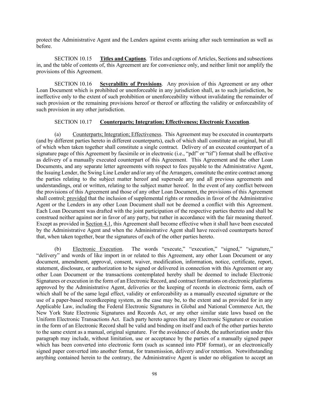 98 protect the Administrative Agent and the Lenders against events arising after such termination as well as before. SECTION 10.15 Titles and Captions. Titles and captions of Articles, Sections and subsections in, and the table of contents of, this Agreement are for convenience only, and neither limit nor amplify the provisions of this Agreement. SECTION 10.16 Severability of Provisions. Any provision of this Agreement or any other Loan Document which is prohibited or unenforceable in any jurisdiction shall, as to such jurisdiction, be ineffective only to the extent of such prohibition or unenforceability without invalidating the remainder of such provision or the remaining provisions hereof or thereof or affecting the validity or enforceability of such provision in any other jurisdiction. SECTION 10.17 Counterparts; Integration; Effectiveness; Electronic Execution. (a) Counterparts; Integration; Effectiveness. This Agreement may be executed in counterparts (and by different parties hereto in different counterparts), each of which shall constitute an original, but all of which when taken together shall constitute a single contract. Delivery of an executed counterpart of a signature page of this Agreement by facsimile or in electronic (i.e., “pdf” or “tif”) format shall be effective as delivery of a manually executed counterpart of this Agreement. This Agreement and the other Loan Documents, and any separate letter agreements with respect to fees payable to the Administrative Agent, the Issuing Lender, the Swing Line Lender and/or any of the Arrangers, constitute the entire contract among the parties relating to the subject matter hereof and supersede any and all previous agreements and understandings, oral or written, relating to the subject matter hereof. In the event of any conflict between the provisions of this Agreement and those of any other Loan Document, the provisions of this Agreement shall control; provided that the inclusion of supplemental rights or remedies in favor of the Administrative Agent or the Lenders in any other Loan Document shall not be deemed a conflict with this Agreement. Each Loan Document was drafted with the joint participation of the respective parties thereto and shall be construed neither against nor in favor of any party, but rather in accordance with the fair meaning thereof. Except as provided in Section 4.1, this Agreement shall become effective when it shall have been executed by the Administrative Agent and when the Administrative Agent shall have received counterparts hereof that, when taken together, bear the signatures of each of the other parties hereto. (b) Electronic Execution. The words “execute,” “execution,” “signed,” “signature,” “delivery” and words of like import in or related to this Agreement, any other Loan Document or any document, amendment, approval, consent, waiver, modification, information, notice, certificate, report, statement, disclosure, or authorization to be signed or delivered in connection with this Agreement or any other Loan Document or the transactions contemplated hereby shall be deemed to include Electronic Signatures or execution in the form of an Electronic Record, and contract formations on electronic platforms approved by the Administrative Agent, deliveries or the keeping of records in electronic form, each of which shall be of the same legal effect, validity or enforceability as a manually executed signature or the use of a paper-based recordkeeping system, as the case may be, to the extent and as provided for in any Applicable Law, including the Federal Electronic Signatures in Global and National Commerce Act, the New York State Electronic Signatures and Records Act, or any other similar state laws based on the Uniform Electronic Transactions Act. Each party hereto agrees that any Electronic Signature or execution in the form of an Electronic Record shall be valid and binding on itself and each of the other parties hereto to the same extent as a manual, original signature. For the avoidance of doubt, the authorization under this paragraph may include, without limitation, use or acceptance by the parties of a manually signed paper which has been converted into electronic form (such as scanned into PDF format), or an electronically signed paper converted into another format, for transmission, delivery and/or retention. Notwithstanding anything contained herein to the contrary, the Administrative Agent is under no obligation to accept an