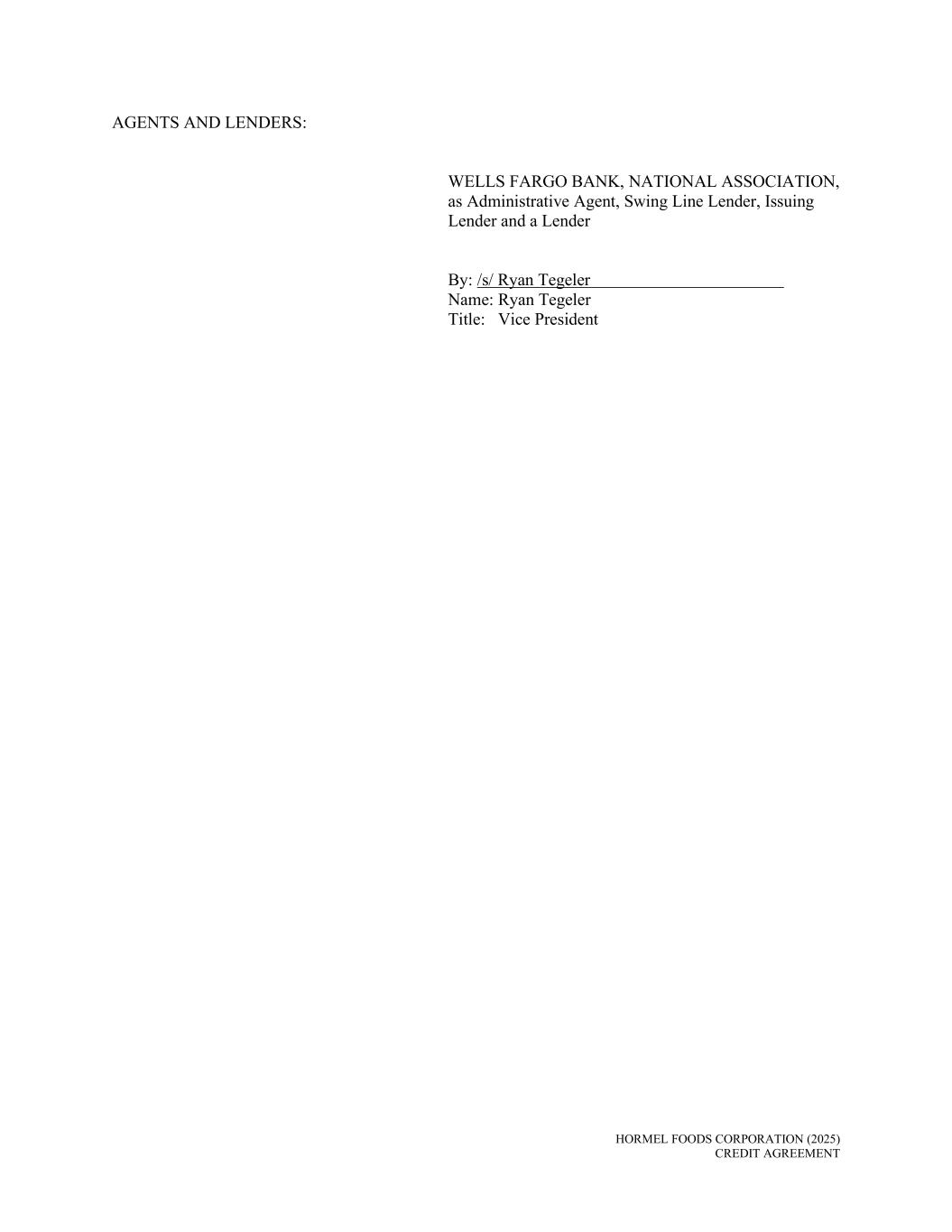 HORMEL FOODS CORPORATION (2025) CREDIT AGREEMENT AGENTS AND LENDERS: WELLS FARGO BANK, NATIONAL ASSOCIATION, as Administrative Agent, Swing Line Lender, Issuing Lender and a Lender By: /s/ Ryan Tegeler Name: Ryan Tegeler Title: Vice President
