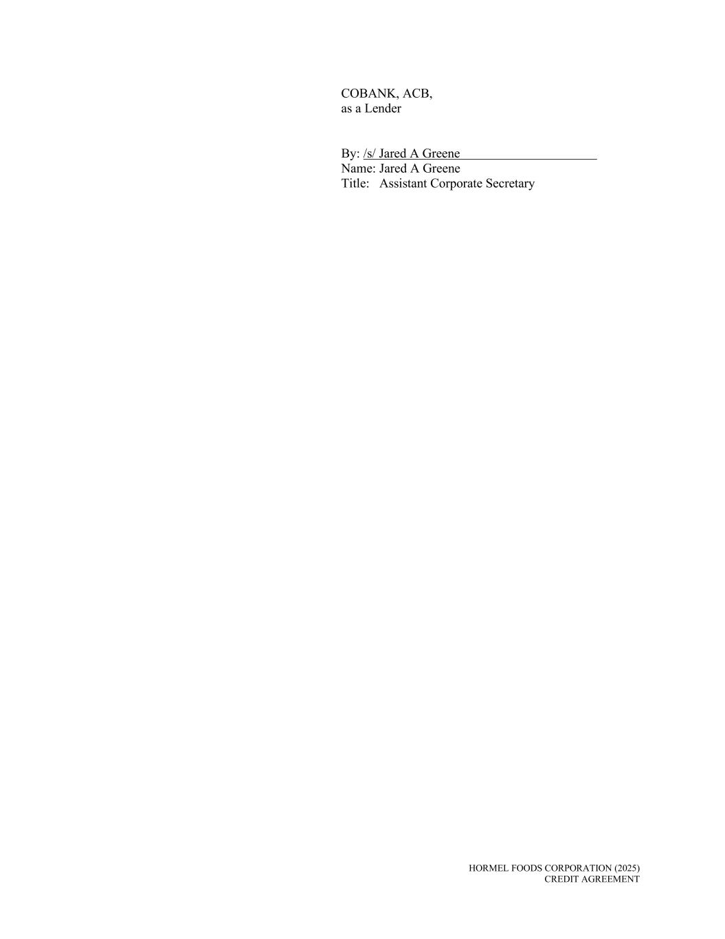 HORMEL FOODS CORPORATION (2025) CREDIT AGREEMENT COBANK, ACB, as a Lender By: /s/ Jared A Greene Name: Jared A Greene Title: Assistant Corporate Secretary