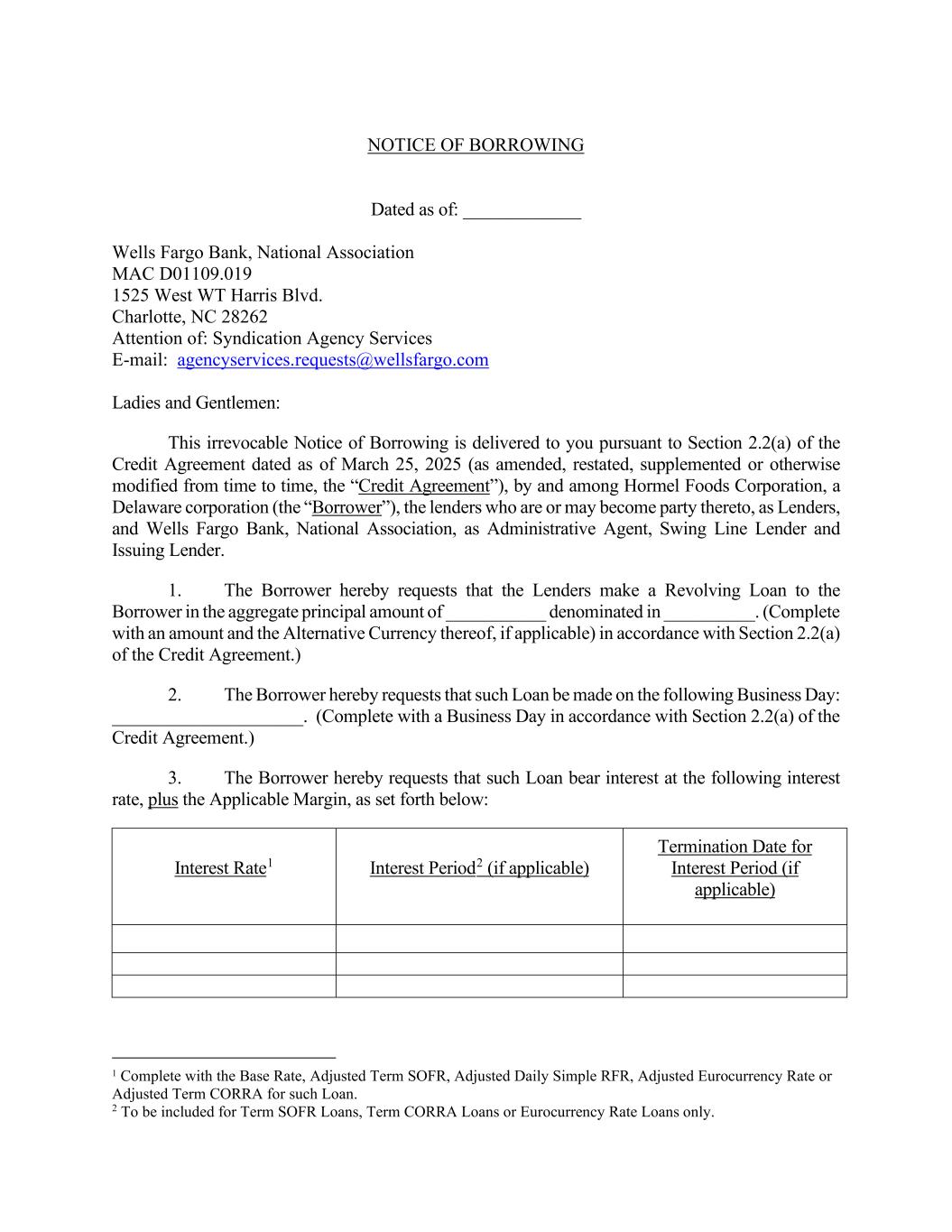 NOTICE OF BORROWING Dated as of: _____________ Wells Fargo Bank, National Association MAC D01109.019 1525 West WT Harris Blvd. Charlotte, NC 28262 Attention of: Syndication Agency Services E-mail: agencyservices.requests@wellsfargo.com Ladies and Gentlemen: This irrevocable Notice of Borrowing is delivered to you pursuant to Section 2.2(a) of the Credit Agreement dated as of March 25, 2025 (as amended, restated, supplemented or otherwise modified from time to time, the “Credit Agreement”), by and among Hormel Foods Corporation, a Delaware corporation (the “Borrower”), the lenders who are or may become party thereto, as Lenders, and Wells Fargo Bank, National Association, as Administrative Agent, Swing Line Lender and Issuing Lender. 1. The Borrower hereby requests that the Lenders make a Revolving Loan to the Borrower in the aggregate principal amount of ___________ denominated in __________. (Complete with an amount and the Alternative Currency thereof, if applicable) in accordance with Section 2.2(a) of the Credit Agreement.) 2. The Borrower hereby requests that such Loan be made on the following Business Day: _____________________. (Complete with a Business Day in accordance with Section 2.2(a) of the Credit Agreement.) 3. The Borrower hereby requests that such Loan bear interest at the following interest rate, plus the Applicable Margin, as set forth below: Interest Rate1 Interest Period2 (if applicable) Termination Date for Interest Period (if applicable) 1 Complete with the Base Rate, Adjusted Term SOFR, Adjusted Daily Simple RFR, Adjusted Eurocurrency Rate or Adjusted Term CORRA for such Loan. 2 To be included for Term SOFR Loans, Term CORRA Loans or Eurocurrency Rate Loans only.