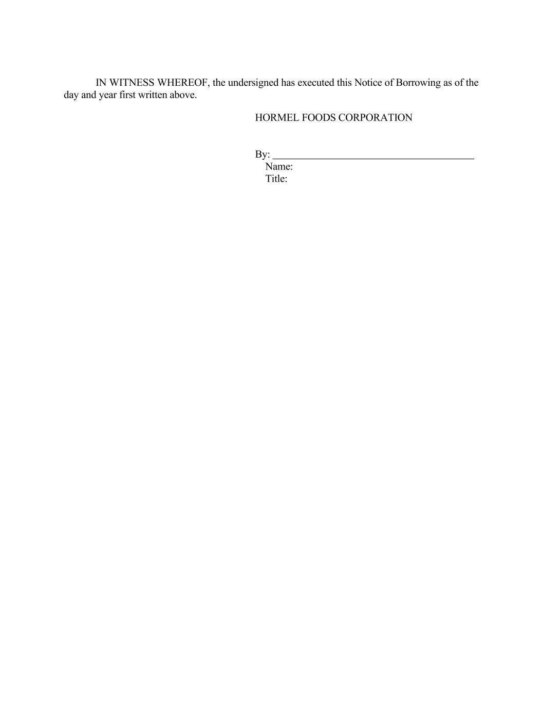 IN WITNESS WHEREOF, the undersigned has executed this Notice of Borrowing as of the day and year first written above. HORMEL FOODS CORPORATION By: Name: Title: