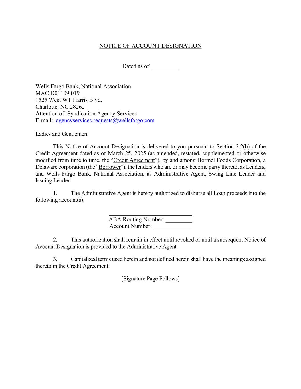 NOTICE OF ACCOUNT DESIGNATION Dated as of: _________ Wells Fargo Bank, National Association MAC D01109.019 1525 West WT Harris Blvd. Charlotte, NC 28262 Attention of: Syndication Agency Services E-mail: agencyservices.requests@wellsfargo.com Ladies and Gentlemen: This Notice of Account Designation is delivered to you pursuant to Section 2.2(b) of the Credit Agreement dated as of March 25, 2025 (as amended, restated, supplemented or otherwise modified from time to time, the “Credit Agreement”), by and among Hormel Foods Corporation, a Delaware corporation (the “Borrower”), the lenders who are or may become party thereto, as Lenders, and Wells Fargo Bank, National Association, as Administrative Agent, Swing Line Lender and Issuing Lender. 1. The Administrative Agent is hereby authorized to disburse all Loan proceeds into the following account(s): ____________________________ ABA Routing Number: _________ Account Number: _____________ 2. This authorization shall remain in effect until revoked or until a subsequent Notice of Account Designation is provided to the Administrative Agent. 3. Capitalized terms used herein and not defined herein shall have the meanings assigned thereto in the Credit Agreement. [Signature Page Follows]