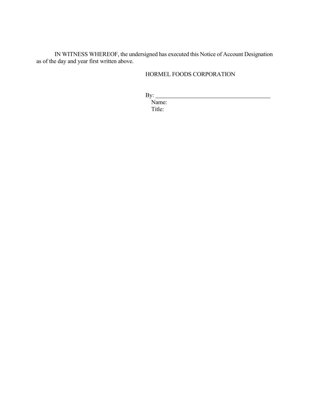 IN WITNESS WHEREOF, the undersigned has executed this Notice of Account Designation as of the day and year first written above. HORMEL FOODS CORPORATION By: Name: Title: