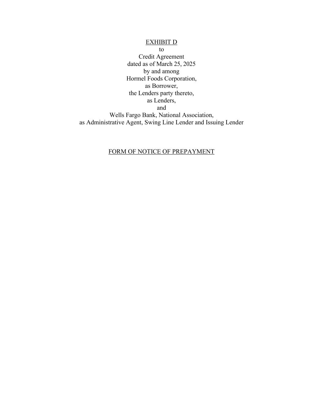 EXHIBIT D to Credit Agreement dated as of March 25, 2025 by and among Hormel Foods Corporation, as Borrower, the Lenders party thereto, as Lenders, and Wells Fargo Bank, National Association, as Administrative Agent, Swing Line Lender and Issuing Lender FORM OF NOTICE OF PREPAYMENT
