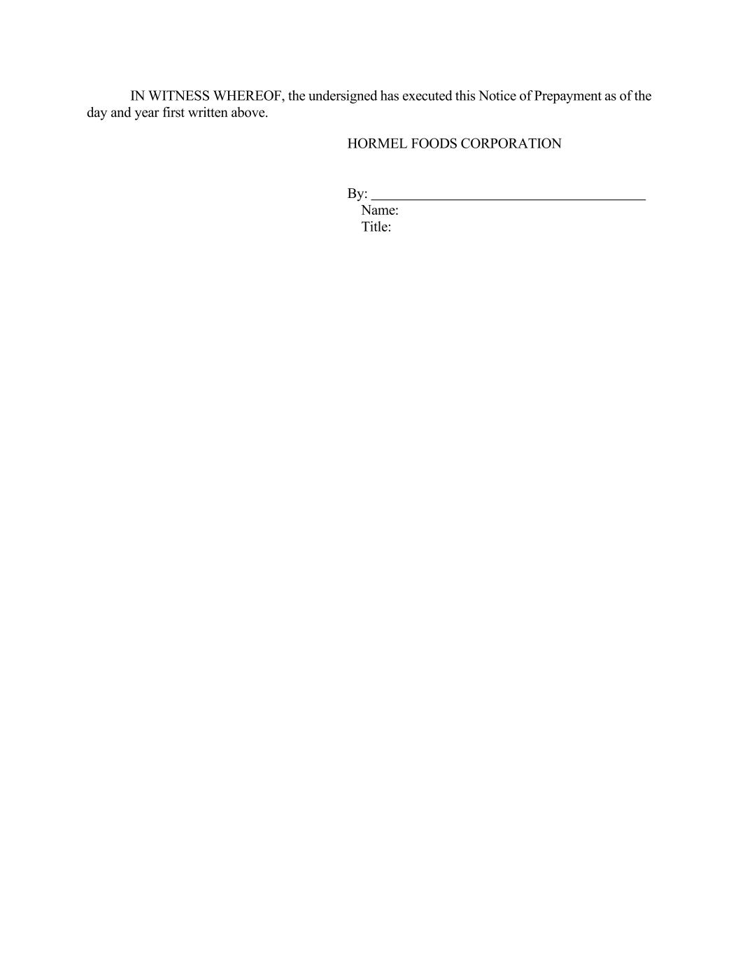 IN WITNESS WHEREOF, the undersigned has executed this Notice of Prepayment as of the day and year first written above. HORMEL FOODS CORPORATION By: Name: Title: