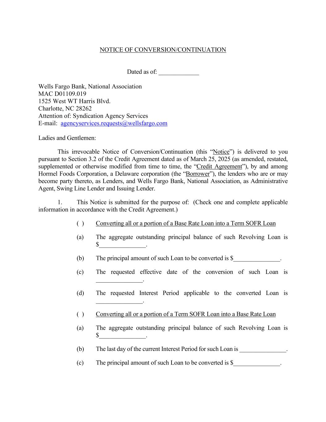 NOTICE OF CONVERSION/CONTINUATION Dated as of: _____________ Wells Fargo Bank, National Association MAC D01109.019 1525 West WT Harris Blvd. Charlotte, NC 28262 Attention of: Syndication Agency Services E-mail: agencyservices.requests@wellsfargo.com Ladies and Gentlemen: This irrevocable Notice of Conversion/Continuation (this “Notice”) is delivered to you pursuant to Section 3.2 of the Credit Agreement dated as of March 25, 2025 (as amended, restated, supplemented or otherwise modified from time to time, the “Credit Agreement”), by and among Hormel Foods Corporation, a Delaware corporation (the “Borrower”), the lenders who are or may become party thereto, as Lenders, and Wells Fargo Bank, National Association, as Administrative Agent, Swing Line Lender and Issuing Lender. 1. This Notice is submitted for the purpose of: (Check one and complete applicable information in accordance with the Credit Agreement.) ( ) Converting all or a portion of a Base Rate Loan into a Term SOFR Loan (a) The aggregate outstanding principal balance of such Revolving Loan is $_______________. (b) The principal amount of such Loan to be converted is $_______________. (c) The requested effective date of the conversion of such Loan is _______________. (d) The requested Interest Period applicable to the converted Loan is _______________. ( ) Converting all or a portion of a Term SOFR Loan into a Base Rate Loan (a) The aggregate outstanding principal balance of such Revolving Loan is $_______________. (b) The last day of the current Interest Period for such Loan is _______________. (c) The principal amount of such Loan to be converted is $_______________.