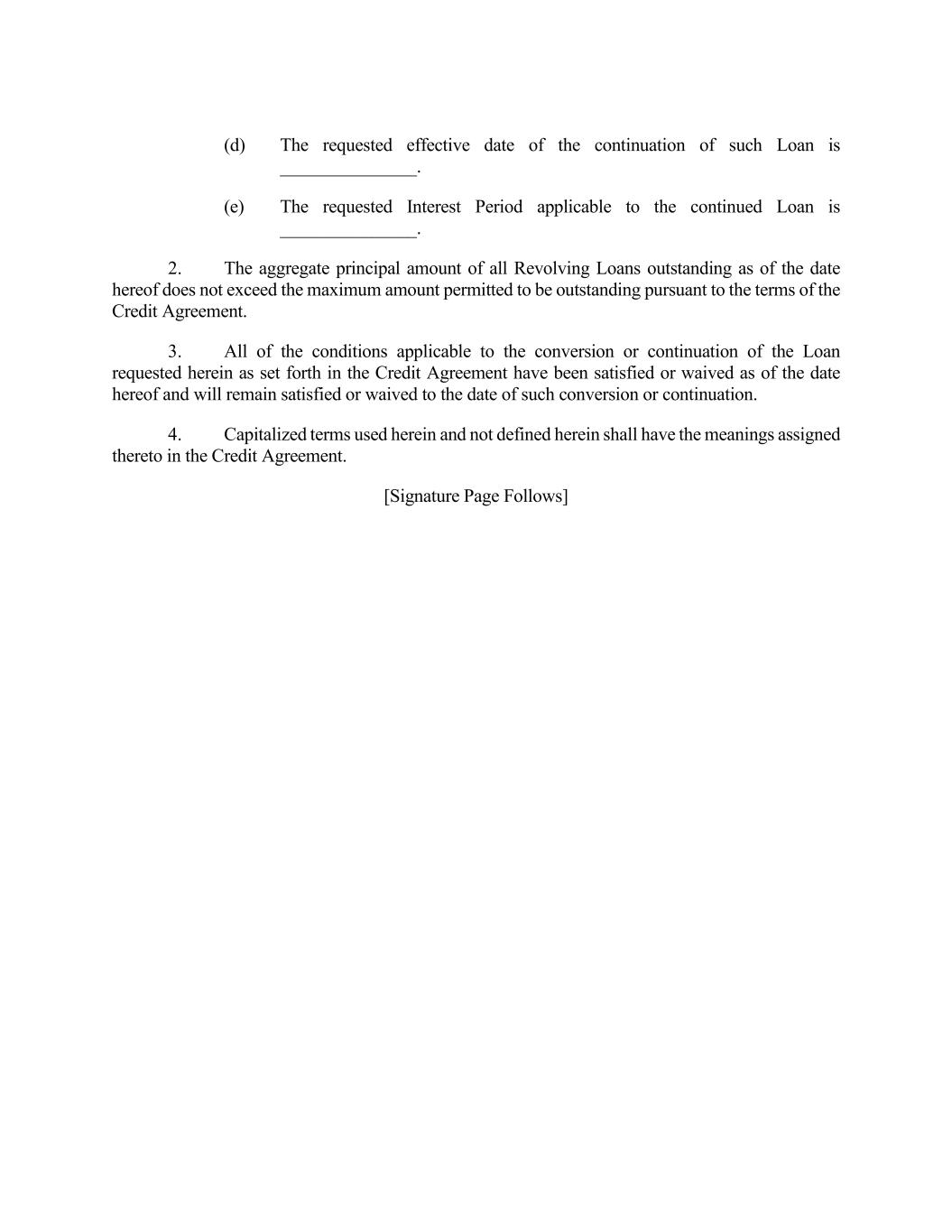 (d) The requested effective date of the continuation of such Loan is _______________. (e) The requested Interest Period applicable to the continued Loan is _______________. 2. The aggregate principal amount of all Revolving Loans outstanding as of the date hereof does not exceed the maximum amount permitted to be outstanding pursuant to the terms of the Credit Agreement. 3. All of the conditions applicable to the conversion or continuation of the Loan requested herein as set forth in the Credit Agreement have been satisfied or waived as of the date hereof and will remain satisfied or waived to the date of such conversion or continuation. 4. Capitalized terms used herein and not defined herein shall have the meanings assigned thereto in the Credit Agreement. [Signature Page Follows]