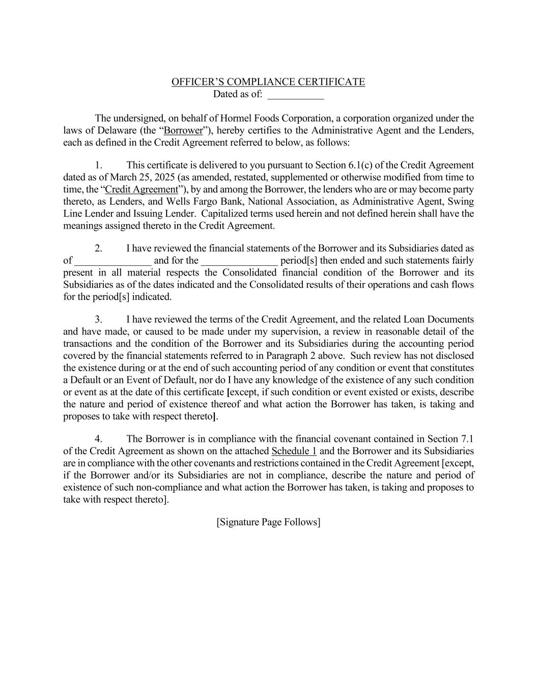 OFFICER’S COMPLIANCE CERTIFICATE Dated as of: ___________ The undersigned, on behalf of Hormel Foods Corporation, a corporation organized under the laws of Delaware (the “Borrower”), hereby certifies to the Administrative Agent and the Lenders, each as defined in the Credit Agreement referred to below, as follows: 1. This certificate is delivered to you pursuant to Section 6.1(c) of the Credit Agreement dated as of March 25, 2025 (as amended, restated, supplemented or otherwise modified from time to time, the “Credit Agreement”), by and among the Borrower, the lenders who are or may become party thereto, as Lenders, and Wells Fargo Bank, National Association, as Administrative Agent, Swing Line Lender and Issuing Lender. Capitalized terms used herein and not defined herein shall have the meanings assigned thereto in the Credit Agreement. 2. I have reviewed the financial statements of the Borrower and its Subsidiaries dated as of _______________ and for the _______________ period[s] then ended and such statements fairly present in all material respects the Consolidated financial condition of the Borrower and its Subsidiaries as of the dates indicated and the Consolidated results of their operations and cash flows for the period[s] indicated. 3. I have reviewed the terms of the Credit Agreement, and the related Loan Documents and have made, or caused to be made under my supervision, a review in reasonable detail of the transactions and the condition of the Borrower and its Subsidiaries during the accounting period covered by the financial statements referred to in Paragraph 2 above. Such review has not disclosed the existence during or at the end of such accounting period of any condition or event that constitutes a Default or an Event of Default, nor do I have any knowledge of the existence of any such condition or event as at the date of this certificate [except, if such condition or event existed or exists, describe the nature and period of existence thereof and what action the Borrower has taken, is taking and proposes to take with respect thereto]. 4. The Borrower is in compliance with the financial covenant contained in Section 7.1 of the Credit Agreement as shown on the attached Schedule 1 and the Borrower and its Subsidiaries are in compliance with the other covenants and restrictions contained in the Credit Agreement [except, if the Borrower and/or its Subsidiaries are not in compliance, describe the nature and period of existence of such non-compliance and what action the Borrower has taken, is taking and proposes to take with respect thereto]. [Signature Page Follows]