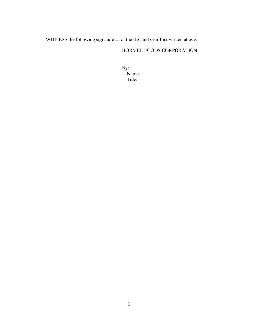 2 WITNESS the following signature as of the day and year first written above. HORMEL FOODS CORPORATION By: Name: Title: