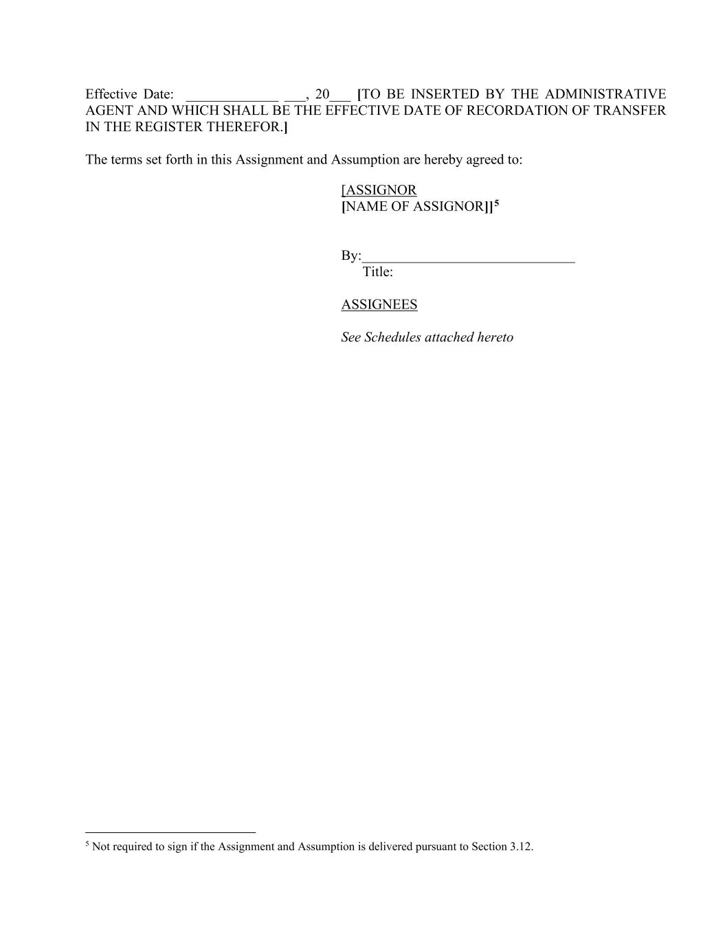 Effective Date: _____________ ___, 20___ [TO BE INSERTED BY THE ADMINISTRATIVE AGENT AND WHICH SHALL BE THE EFFECTIVE DATE OF RECORDATION OF TRANSFER IN THE REGISTER THEREFOR.] The terms set forth in this Assignment and Assumption are hereby agreed to: [ASSIGNOR [NAME OF ASSIGNOR]]5 By:______________________________ Title: ASSIGNEES See Schedules attached hereto 5 Not required to sign if the Assignment and Assumption is delivered pursuant to Section 3.12.