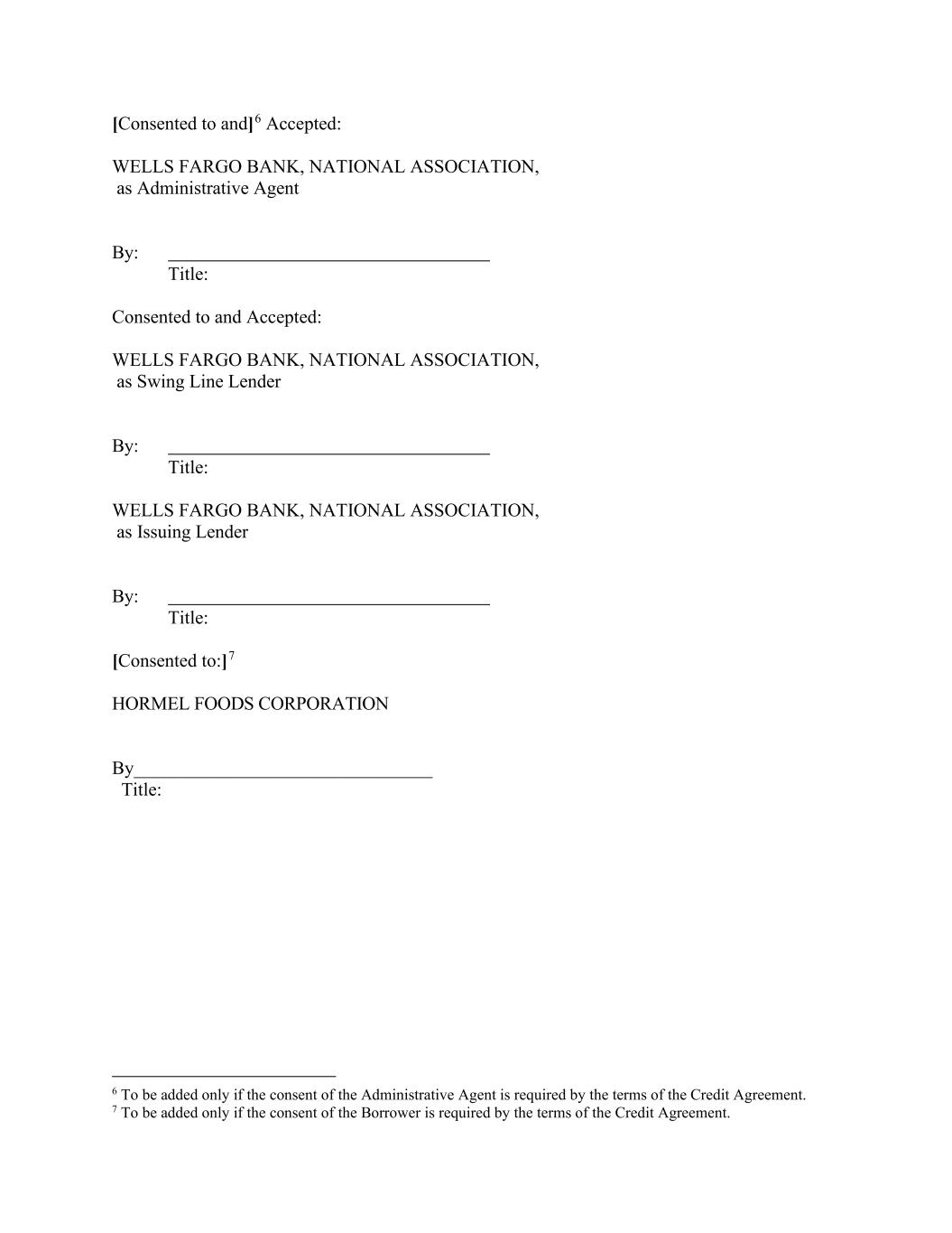 [Consented to and]6 Accepted: WELLS FARGO BANK, NATIONAL ASSOCIATION, as Administrative Agent By: Title: Consented to and Accepted: WELLS FARGO BANK, NATIONAL ASSOCIATION, as Swing Line Lender By: Title: WELLS FARGO BANK, NATIONAL ASSOCIATION, as Issuing Lender By: Title: [Consented to:]7 HORMEL FOODS CORPORATION By________________________________ Title: 6 To be added only if the consent of the Administrative Agent is required by the terms of the Credit Agreement. 7 To be added only if the consent of the Borrower is required by the terms of the Credit Agreement.