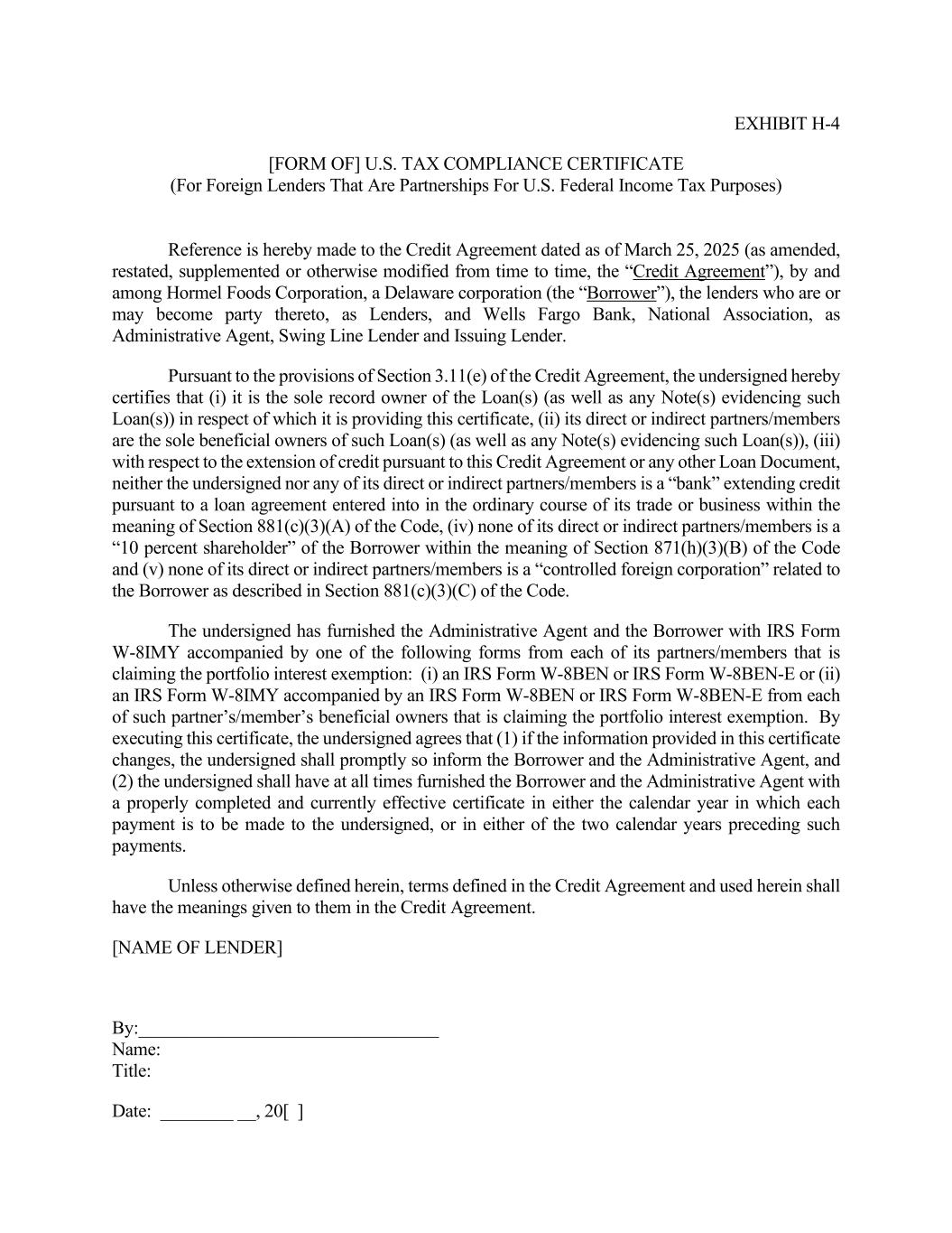 EXHIBIT H-4 [FORM OF] U.S. TAX COMPLIANCE CERTIFICATE (For Foreign Lenders That Are Partnerships For U.S. Federal Income Tax Purposes) Reference is hereby made to the Credit Agreement dated as of March 25, 2025 (as amended, restated, supplemented or otherwise modified from time to time, the “Credit Agreement”), by and among Hormel Foods Corporation, a Delaware corporation (the “Borrower”), the lenders who are or may become party thereto, as Lenders, and Wells Fargo Bank, National Association, as Administrative Agent, Swing Line Lender and Issuing Lender. Pursuant to the provisions of Section 3.11(e) of the Credit Agreement, the undersigned hereby certifies that (i) it is the sole record owner of the Loan(s) (as well as any Note(s) evidencing such Loan(s)) in respect of which it is providing this certificate, (ii) its direct or indirect partners/members are the sole beneficial owners of such Loan(s) (as well as any Note(s) evidencing such Loan(s)), (iii) with respect to the extension of credit pursuant to this Credit Agreement or any other Loan Document, neither the undersigned nor any of its direct or indirect partners/members is a “bank” extending credit pursuant to a loan agreement entered into in the ordinary course of its trade or business within the meaning of Section 881(c)(3)(A) of the Code, (iv) none of its direct or indirect partners/members is a “10 percent shareholder” of the Borrower within the meaning of Section 871(h)(3)(B) of the Code and (v) none of its direct or indirect partners/members is a “controlled foreign corporation” related to the Borrower as described in Section 881(c)(3)(C) of the Code. The undersigned has furnished the Administrative Agent and the Borrower with IRS Form W-8IMY accompanied by one of the following forms from each of its partners/members that is claiming the portfolio interest exemption: (i) an IRS Form W-8BEN or IRS Form W-8BEN-E or (ii) an IRS Form W-8IMY accompanied by an IRS Form W-8BEN or IRS Form W-8BEN-E from each of such partner’s/member’s beneficial owners that is claiming the portfolio interest exemption. By executing this certificate, the undersigned agrees that (1) if the information provided in this certificate changes, the undersigned shall promptly so inform the Borrower and the Administrative Agent, and (2) the undersigned shall have at all times furnished the Borrower and the Administrative Agent with a properly completed and currently effective certificate in either the calendar year in which each payment is to be made to the undersigned, or in either of the two calendar years preceding such payments. Unless otherwise defined herein, terms defined in the Credit Agreement and used herein shall have the meanings given to them in the Credit Agreement. [NAME OF LENDER] By:_________________________________ Name: Title: Date: ________ __, 20[ ]