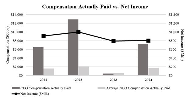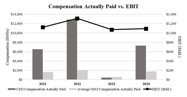 The charts shown below illustrate compensation actually paid to our CEO and the average compensation actually paid to our Other NEOs set forth in the Pay Versus Performance Table above, as compared against the following performance measures: our TSR and the TSR of our peer group, our net income, and our EBIT.