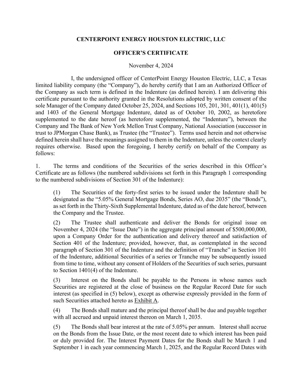 CENTERPOINT ENERGY HOUSTON ELECTRIC, LLC OFFICER’S CERTIFICATE November 4, 2024 I, the undersigned officer of CenterPoint Energy Houston Electric, LLC, a Texas limited liability company (the “Company”), do hereby certify that I am an Authorized Officer of the Company as such term is defined in the Indenture (as defined herein). I am delivering this certificate pursuant to the authority granted in the Resolutions adopted by written consent of the sole Manager of the Company dated October 25, 2024, and Sections 105, 201, 301, 401(1), 401(5) and 1403 of the General Mortgage Indenture, dated as of October 10, 2002, as heretofore supplemented to the date hereof (as heretofore supplemented, the “Indenture”), between the Company and The Bank of New York Mellon Trust Company, National Association (successor in trust to JPMorgan Chase Bank), as Trustee (the “Trustee”). Terms used herein and not otherwise defined herein shall have the meanings assigned to them in the Indenture, unless the context clearly requires otherwise. Based upon the foregoing, I hereby certify on behalf of the Company as follows: 1. The terms and conditions of the Securities of the series described in this Officer’s Certificate are as follows (the numbered subdivisions set forth in this Paragraph 1 corresponding to the numbered subdivisions of Section 301 of the Indenture): (1) The Securities of the forty-first series to be issued under the Indenture shall be designated as the “5.05% General Mortgage Bonds, Series AO, due 2035” (the “Bonds”), as set forth in the Thirty-Sixth Supplemental Indenture, dated as of the date hereof, between the Company and the Trustee. (2) The Trustee shall authenticate and deliver the Bonds for original issue on November 4, 2024 (the “Issue Date”) in the aggregate principal amount of $500,000,000, upon a Company Order for the authentication and delivery thereof and satisfaction of Section 401 of the Indenture; provided, however, that, as contemplated in the second paragraph of Section 301 of the Indenture and the definition of “Tranche” in Section 101 of the Indenture, additional Securities of a series or Tranche may be subsequently issued from time to time, without any consent of Holders of the Securities of such series, pursuant to Section 1401(4) of the Indenture. (3) Interest on the Bonds shall be payable to the Persons in whose names such Securities are registered at the close of business on the Regular Record Date for such interest (as specified in (5) below), except as otherwise expressly provided in the form of such Securities attached hereto as Exhibit A. (4) The Bonds shall mature and the principal thereof shall be due and payable together with all accrued and unpaid interest thereon on March 1, 2035. (5) The Bonds shall bear interest at the rate of 5.05% per annum. Interest shall accrue on the Bonds from the Issue Date, or the most recent date to which interest has been paid or duly provided for. The Interest Payment Dates for the Bonds shall be March 1 and September 1 in each year commencing March 1, 2025, and the Regular Record Dates with