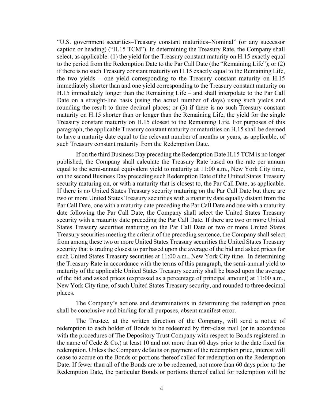 4 “U.S. government securities–Treasury constant maturities–Nominal” (or any successor caption or heading) (“H.15 TCM”). In determining the Treasury Rate, the Company shall select, as applicable: (1) the yield for the Treasury constant maturity on H.15 exactly equal to the period from the Redemption Date to the Par Call Date (the “Remaining Life”); or (2) if there is no such Treasury constant maturity on H.15 exactly equal to the Remaining Life, the two yields – one yield corresponding to the Treasury constant maturity on H.15 immediately shorter than and one yield corresponding to the Treasury constant maturity on H.15 immediately longer than the Remaining Life – and shall interpolate to the Par Call Date on a straight-line basis (using the actual number of days) using such yields and rounding the result to three decimal places; or (3) if there is no such Treasury constant maturity on H.15 shorter than or longer than the Remaining Life, the yield for the single Treasury constant maturity on H.15 closest to the Remaining Life. For purposes of this paragraph, the applicable Treasury constant maturity or maturities on H.15 shall be deemed to have a maturity date equal to the relevant number of months or years, as applicable, of such Treasury constant maturity from the Redemption Date. If on the third Business Day preceding the Redemption Date H.15 TCM is no longer published, the Company shall calculate the Treasury Rate based on the rate per annum equal to the semi-annual equivalent yield to maturity at 11:00 a.m., New York City time, on the second Business Day preceding such Redemption Date of the United States Treasury security maturing on, or with a maturity that is closest to, the Par Call Date, as applicable. If there is no United States Treasury security maturing on the Par Call Date but there are two or more United States Treasury securities with a maturity date equally distant from the Par Call Date, one with a maturity date preceding the Par Call Date and one with a maturity date following the Par Call Date, the Company shall select the United States Treasury security with a maturity date preceding the Par Call Date. If there are two or more United States Treasury securities maturing on the Par Call Date or two or more United States Treasury securities meeting the criteria of the preceding sentence, the Company shall select from among these two or more United States Treasury securities the United States Treasury security that is trading closest to par based upon the average of the bid and asked prices for such United States Treasury securities at 11:00 a.m., New York City time. In determining the Treasury Rate in accordance with the terms of this paragraph, the semi-annual yield to maturity of the applicable United States Treasury security shall be based upon the average of the bid and asked prices (expressed as a percentage of principal amount) at 11:00 a.m., New York City time, of such United States Treasury security, and rounded to three decimal places. The Company’s actions and determinations in determining the redemption price shall be conclusive and binding for all purposes, absent manifest error. The Trustee, at the written direction of the Company, will send a notice of redemption to each holder of Bonds to be redeemed by first-class mail (or in accordance with the procedures of The Depository Trust Company with respect to Bonds registered in the name of Cede & Co.) at least 10 and not more than 60 days prior to the date fixed for redemption. Unless the Company defaults on payment of the redemption price, interest will cease to accrue on the Bonds or portions thereof called for redemption on the Redemption Date. If fewer than all of the Bonds are to be redeemed, not more than 60 days prior to the Redemption Date, the particular Bonds or portions thereof called for redemption will be