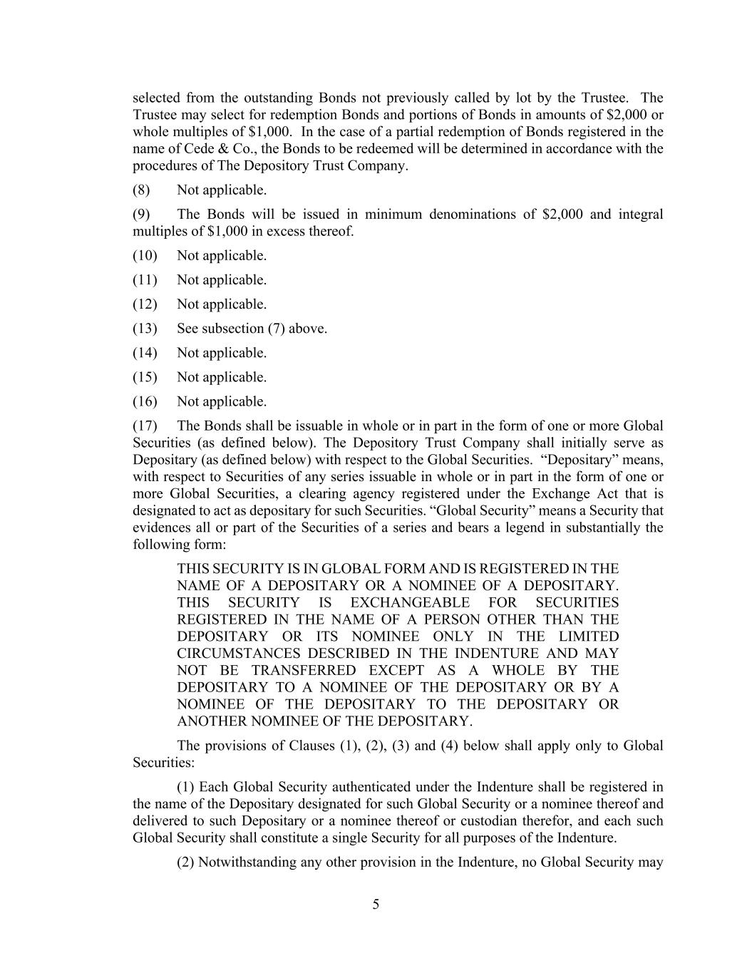 5 selected from the outstanding Bonds not previously called by lot by the Trustee. The Trustee may select for redemption Bonds and portions of Bonds in amounts of $2,000 or whole multiples of $1,000. In the case of a partial redemption of Bonds registered in the name of Cede & Co., the Bonds to be redeemed will be determined in accordance with the procedures of The Depository Trust Company. (8) Not applicable. (9) The Bonds will be issued in minimum denominations of $2,000 and integral multiples of $1,000 in excess thereof. (10) Not applicable. (11) Not applicable. (12) Not applicable. (13) See subsection (7) above. (14) Not applicable. (15) Not applicable. (16) Not applicable. (17) The Bonds shall be issuable in whole or in part in the form of one or more Global Securities (as defined below). The Depository Trust Company shall initially serve as Depositary (as defined below) with respect to the Global Securities. “Depositary” means, with respect to Securities of any series issuable in whole or in part in the form of one or more Global Securities, a clearing agency registered under the Exchange Act that is designated to act as depositary for such Securities. “Global Security” means a Security that evidences all or part of the Securities of a series and bears a legend in substantially the following form: THIS SECURITY IS IN GLOBAL FORM AND IS REGISTERED IN THE NAME OF A DEPOSITARY OR A NOMINEE OF A DEPOSITARY. THIS SECURITY IS EXCHANGEABLE FOR SECURITIES REGISTERED IN THE NAME OF A PERSON OTHER THAN THE DEPOSITARY OR ITS NOMINEE ONLY IN THE LIMITED CIRCUMSTANCES DESCRIBED IN THE INDENTURE AND MAY NOT BE TRANSFERRED EXCEPT AS A WHOLE BY THE DEPOSITARY TO A NOMINEE OF THE DEPOSITARY OR BY A NOMINEE OF THE DEPOSITARY TO THE DEPOSITARY OR ANOTHER NOMINEE OF THE DEPOSITARY. The provisions of Clauses (1), (2), (3) and (4) below shall apply only to Global Securities: (1) Each Global Security authenticated under the Indenture shall be registered in the name of the Depositary designated for such Global Security or a nominee thereof and delivered to such Depositary or a nominee thereof or custodian therefor, and each such Global Security shall constitute a single Security for all purposes of the Indenture. (2) Notwithstanding any other provision in the Indenture, no Global Security may