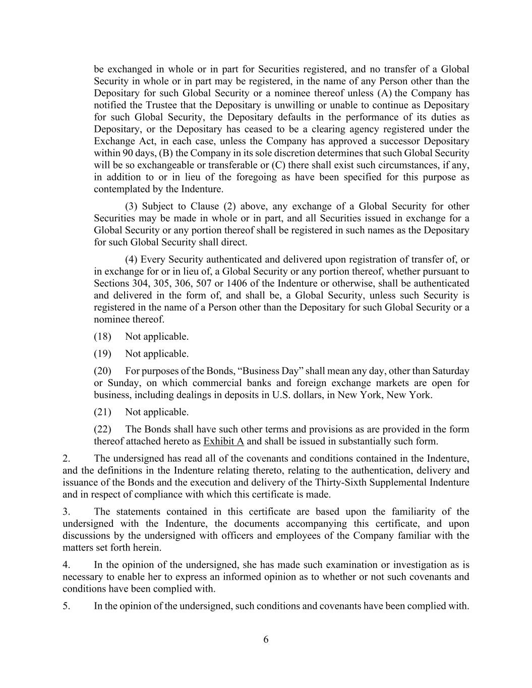 6 be exchanged in whole or in part for Securities registered, and no transfer of a Global Security in whole or in part may be registered, in the name of any Person other than the Depositary for such Global Security or a nominee thereof unless (A) the Company has notified the Trustee that the Depositary is unwilling or unable to continue as Depositary for such Global Security, the Depositary defaults in the performance of its duties as Depositary, or the Depositary has ceased to be a clearing agency registered under the Exchange Act, in each case, unless the Company has approved a successor Depositary within 90 days, (B) the Company in its sole discretion determines that such Global Security will be so exchangeable or transferable or (C) there shall exist such circumstances, if any, in addition to or in lieu of the foregoing as have been specified for this purpose as contemplated by the Indenture. (3) Subject to Clause (2) above, any exchange of a Global Security for other Securities may be made in whole or in part, and all Securities issued in exchange for a Global Security or any portion thereof shall be registered in such names as the Depositary for such Global Security shall direct. (4) Every Security authenticated and delivered upon registration of transfer of, or in exchange for or in lieu of, a Global Security or any portion thereof, whether pursuant to Sections 304, 305, 306, 507 or 1406 of the Indenture or otherwise, shall be authenticated and delivered in the form of, and shall be, a Global Security, unless such Security is registered in the name of a Person other than the Depositary for such Global Security or a nominee thereof. (18) Not applicable. (19) Not applicable. (20) For purposes of the Bonds, “Business Day” shall mean any day, other than Saturday or Sunday, on which commercial banks and foreign exchange markets are open for business, including dealings in deposits in U.S. dollars, in New York, New York. (21) Not applicable. (22) The Bonds shall have such other terms and provisions as are provided in the form thereof attached hereto as Exhibit A and shall be issued in substantially such form. 2. The undersigned has read all of the covenants and conditions contained in the Indenture, and the definitions in the Indenture relating thereto, relating to the authentication, delivery and issuance of the Bonds and the execution and delivery of the Thirty-Sixth Supplemental Indenture and in respect of compliance with which this certificate is made. 3. The statements contained in this certificate are based upon the familiarity of the undersigned with the Indenture, the documents accompanying this certificate, and upon discussions by the undersigned with officers and employees of the Company familiar with the matters set forth herein. 4. In the opinion of the undersigned, she has made such examination or investigation as is necessary to enable her to express an informed opinion as to whether or not such covenants and conditions have been complied with. 5. In the opinion of the undersigned, such conditions and covenants have been complied with.