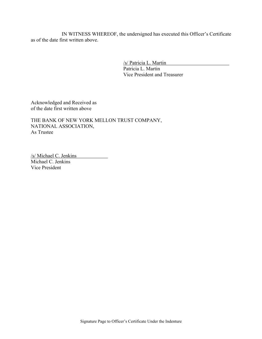 Signature Page to Officer’s Certificate Under the Indenture IN WITNESS WHEREOF, the undersigned has executed this Officer’s Certificate as of the date first written above. /s/ Patricia L. Martin Patricia L. Martin Vice President and Treasurer Acknowledged and Received as of the date first written above THE BANK OF NEW YORK MELLON TRUST COMPANY, NATIONAL ASSOCIATION, As Trustee /s/ Michael C. Jenkins Michael C. Jenkins Vice President