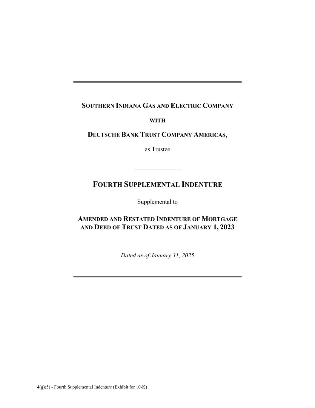 4(g)(5) - Fourth Supplemental Indenture (Exhibit for 10-K) SOUTHERN INDIANA GAS AND ELECTRIC COMPANY WITH DEUTSCHE BANK TRUST COMPANY AMERICAS, as Trustee _______________ FOURTH SUPPLEMENTAL INDENTURE Supplemental to AMENDED AND RESTATED INDENTURE OF MORTGAGE AND DEED OF TRUST DATED AS OF JANUARY 1, 2023 Dated as of January 31, 2025