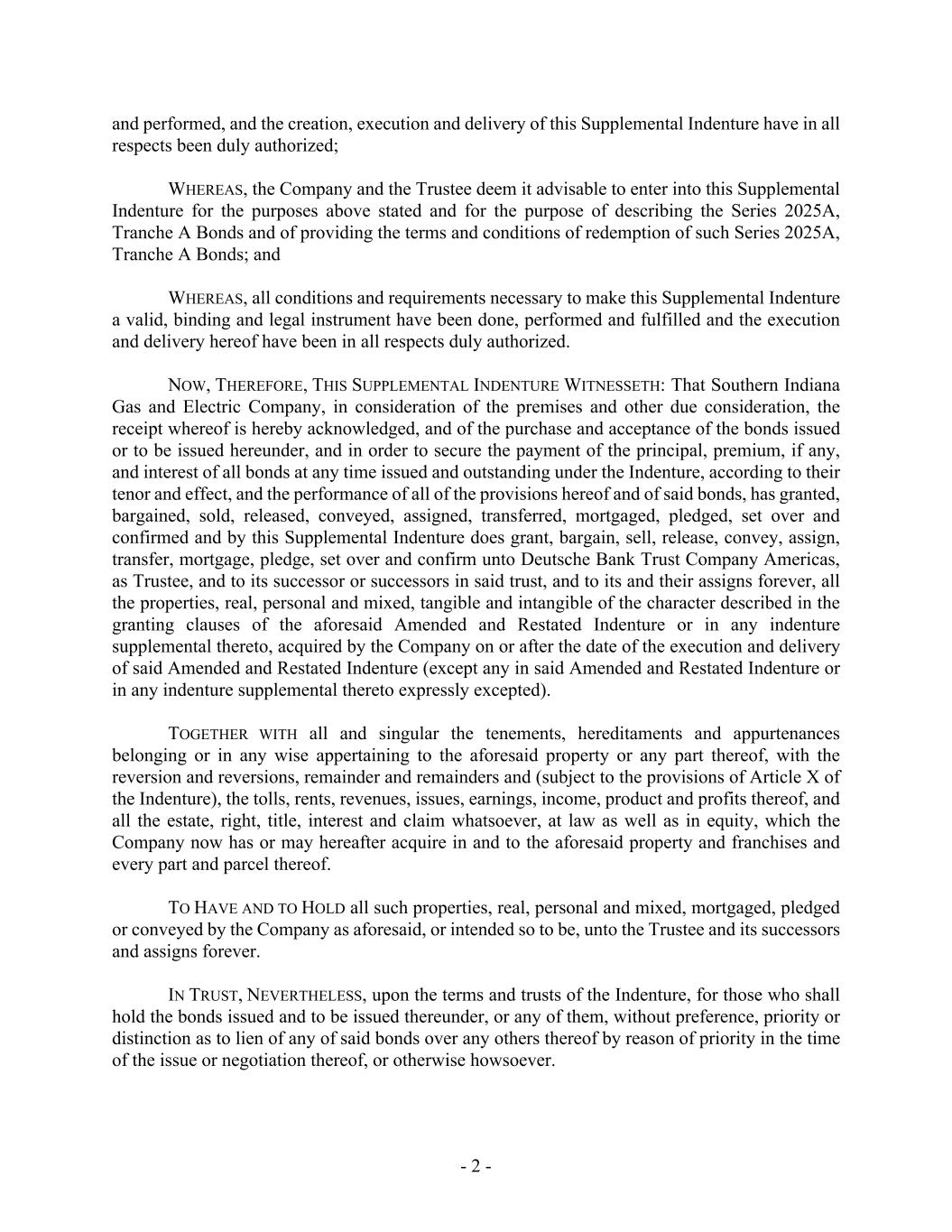 - 2 - and performed, and the creation, execution and delivery of this Supplemental Indenture have in all respects been duly authorized; WHEREAS, the Company and the Trustee deem it advisable to enter into this Supplemental Indenture for the purposes above stated and for the purpose of describing the Series 2025A, Tranche A Bonds and of providing the terms and conditions of redemption of such Series 2025A, Tranche A Bonds; and WHEREAS, all conditions and requirements necessary to make this Supplemental Indenture a valid, binding and legal instrument have been done, performed and fulfilled and the execution and delivery hereof have been in all respects duly authorized. NOW, THEREFORE, THIS SUPPLEMENTAL INDENTURE WITNESSETH: That Southern Indiana Gas and Electric Company, in consideration of the premises and other due consideration, the receipt whereof is hereby acknowledged, and of the purchase and acceptance of the bonds issued or to be issued hereunder, and in order to secure the payment of the principal, premium, if any, and interest of all bonds at any time issued and outstanding under the Indenture, according to their tenor and effect, and the performance of all of the provisions hereof and of said bonds, has granted, bargained, sold, released, conveyed, assigned, transferred, mortgaged, pledged, set over and confirmed and by this Supplemental Indenture does grant, bargain, sell, release, convey, assign, transfer, mortgage, pledge, set over and confirm unto Deutsche Bank Trust Company Americas, as Trustee, and to its successor or successors in said trust, and to its and their assigns forever, all the properties, real, personal and mixed, tangible and intangible of the character described in the granting clauses of the aforesaid Amended and Restated Indenture or in any indenture supplemental thereto, acquired by the Company on or after the date of the execution and delivery of said Amended and Restated Indenture (except any in said Amended and Restated Indenture or in any indenture supplemental thereto expressly excepted). TOGETHER WITH all and singular the tenements, hereditaments and appurtenances belonging or in any wise appertaining to the aforesaid property or any part thereof, with the reversion and reversions, remainder and remainders and (subject to the provisions of Article X of the Indenture), the tolls, rents, revenues, issues, earnings, income, product and profits thereof, and all the estate, right, title, interest and claim whatsoever, at law as well as in equity, which the Company now has or may hereafter acquire in and to the aforesaid property and franchises and every part and parcel thereof. TO HAVE AND TO HOLD all such properties, real, personal and mixed, mortgaged, pledged or conveyed by the Company as aforesaid, or intended so to be, unto the Trustee and its successors and assigns forever. IN TRUST, NEVERTHELESS, upon the terms and trusts of the Indenture, for those who shall hold the bonds issued and to be issued thereunder, or any of them, without preference, priority or distinction as to lien of any of said bonds over any others thereof by reason of priority in the time of the issue or negotiation thereof, or otherwise howsoever.
