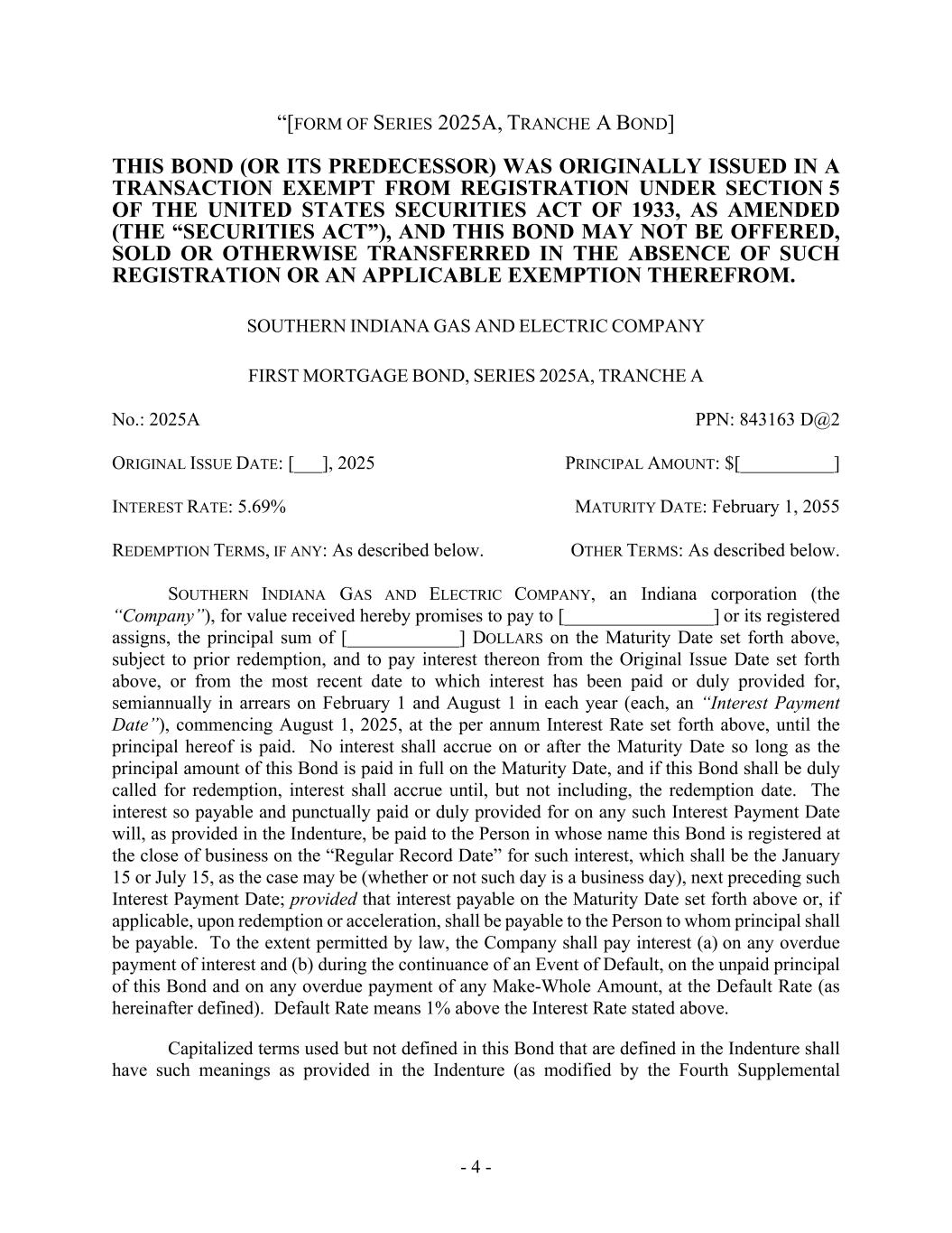 - 4 - “[FORM OF SERIES 2025A, TRANCHE A BOND] THIS BOND (OR ITS PREDECESSOR) WAS ORIGINALLY ISSUED IN A TRANSACTION EXEMPT FROM REGISTRATION UNDER SECTION 5 OF THE UNITED STATES SECURITIES ACT OF 1933, AS AMENDED (THE “SECURITIES ACT”), AND THIS BOND MAY NOT BE OFFERED, SOLD OR OTHERWISE TRANSFERRED IN THE ABSENCE OF SUCH REGISTRATION OR AN APPLICABLE EXEMPTION THEREFROM. SOUTHERN INDIANA GAS AND ELECTRIC COMPANY FIRST MORTGAGE BOND, SERIES 2025A, TRANCHE A No.: 2025A PPN: 843163 D@2 ORIGINAL ISSUE DATE: [___], 2025 PRINCIPAL AMOUNT: $[__________] INTEREST RATE: 5.69% MATURITY DATE: February 1, 2055 REDEMPTION TERMS, IF ANY: As described below. OTHER TERMS: As described below. SOUTHERN INDIANA GAS AND ELECTRIC COMPANY, an Indiana corporation (the “Company”), for value received hereby promises to pay to [________________] or its registered assigns, the principal sum of [____________] DOLLARS on the Maturity Date set forth above, subject to prior redemption, and to pay interest thereon from the Original Issue Date set forth above, or from the most recent date to which interest has been paid or duly provided for, semiannually in arrears on February 1 and August 1 in each year (each, an “Interest Payment Date”), commencing August 1, 2025, at the per annum Interest Rate set forth above, until the principal hereof is paid. No interest shall accrue on or after the Maturity Date so long as the principal amount of this Bond is paid in full on the Maturity Date, and if this Bond shall be duly called for redemption, interest shall accrue until, but not including, the redemption date. The interest so payable and punctually paid or duly provided for on any such Interest Payment Date will, as provided in the Indenture, be paid to the Person in whose name this Bond is registered at the close of business on the “Regular Record Date” for such interest, which shall be the January 15 or July 15, as the case may be (whether or not such day is a business day), next preceding such Interest Payment Date; provided that interest payable on the Maturity Date set forth above or, if applicable, upon redemption or acceleration, shall be payable to the Person to whom principal shall be payable. To the extent permitted by law, the Company shall pay interest (a) on any overdue payment of interest and (b) during the continuance of an Event of Default, on the unpaid principal of this Bond and on any overdue payment of any Make-Whole Amount, at the Default Rate (as hereinafter defined). Default Rate means 1% above the Interest Rate stated above. Capitalized terms used but not defined in this Bond that are defined in the Indenture shall have such meanings as provided in the Indenture (as modified by the Fourth Supplemental