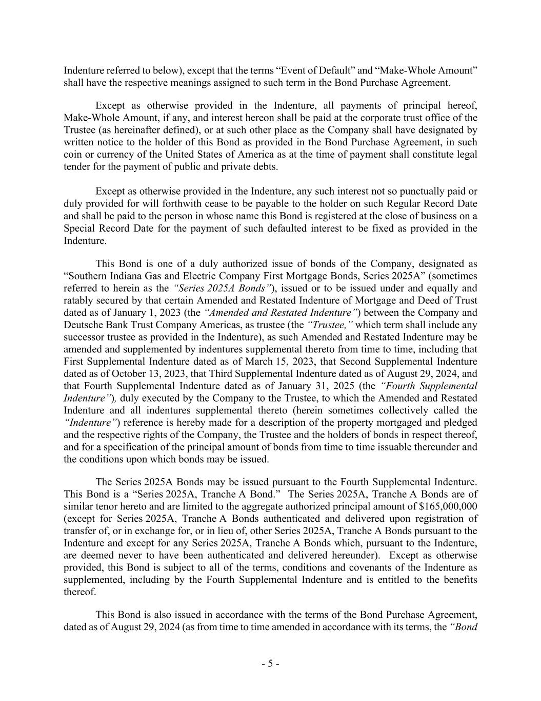 - 5 - Indenture referred to below), except that the terms “Event of Default” and “Make-Whole Amount” shall have the respective meanings assigned to such term in the Bond Purchase Agreement. Except as otherwise provided in the Indenture, all payments of principal hereof, Make-Whole Amount, if any, and interest hereon shall be paid at the corporate trust office of the Trustee (as hereinafter defined), or at such other place as the Company shall have designated by written notice to the holder of this Bond as provided in the Bond Purchase Agreement, in such coin or currency of the United States of America as at the time of payment shall constitute legal tender for the payment of public and private debts. Except as otherwise provided in the Indenture, any such interest not so punctually paid or duly provided for will forthwith cease to be payable to the holder on such Regular Record Date and shall be paid to the person in whose name this Bond is registered at the close of business on a Special Record Date for the payment of such defaulted interest to be fixed as provided in the Indenture. This Bond is one of a duly authorized issue of bonds of the Company, designated as “Southern Indiana Gas and Electric Company First Mortgage Bonds, Series 2025A” (sometimes referred to herein as the “Series 2025A Bonds”), issued or to be issued under and equally and ratably secured by that certain Amended and Restated Indenture of Mortgage and Deed of Trust dated as of January 1, 2023 (the “Amended and Restated Indenture”) between the Company and Deutsche Bank Trust Company Americas, as trustee (the “Trustee,” which term shall include any successor trustee as provided in the Indenture), as such Amended and Restated Indenture may be amended and supplemented by indentures supplemental thereto from time to time, including that First Supplemental Indenture dated as of March 15, 2023, that Second Supplemental Indenture dated as of October 13, 2023, that Third Supplemental Indenture dated as of August 29, 2024, and that Fourth Supplemental Indenture dated as of January 31, 2025 (the “Fourth Supplemental Indenture”), duly executed by the Company to the Trustee, to which the Amended and Restated Indenture and all indentures supplemental thereto (herein sometimes collectively called the “Indenture”) reference is hereby made for a description of the property mortgaged and pledged and the respective rights of the Company, the Trustee and the holders of bonds in respect thereof, and for a specification of the principal amount of bonds from time to time issuable thereunder and the conditions upon which bonds may be issued. The Series 2025A Bonds may be issued pursuant to the Fourth Supplemental Indenture. This Bond is a “Series 2025A, Tranche A Bond.” The Series 2025A, Tranche A Bonds are of similar tenor hereto and are limited to the aggregate authorized principal amount of $165,000,000 (except for Series 2025A, Tranche A Bonds authenticated and delivered upon registration of transfer of, or in exchange for, or in lieu of, other Series 2025A, Tranche A Bonds pursuant to the Indenture and except for any Series 2025A, Tranche A Bonds which, pursuant to the Indenture, are deemed never to have been authenticated and delivered hereunder). Except as otherwise provided, this Bond is subject to all of the terms, conditions and covenants of the Indenture as supplemented, including by the Fourth Supplemental Indenture and is entitled to the benefits thereof. This Bond is also issued in accordance with the terms of the Bond Purchase Agreement, dated as of August 29, 2024 (as from time to time amended in accordance with its terms, the “Bond