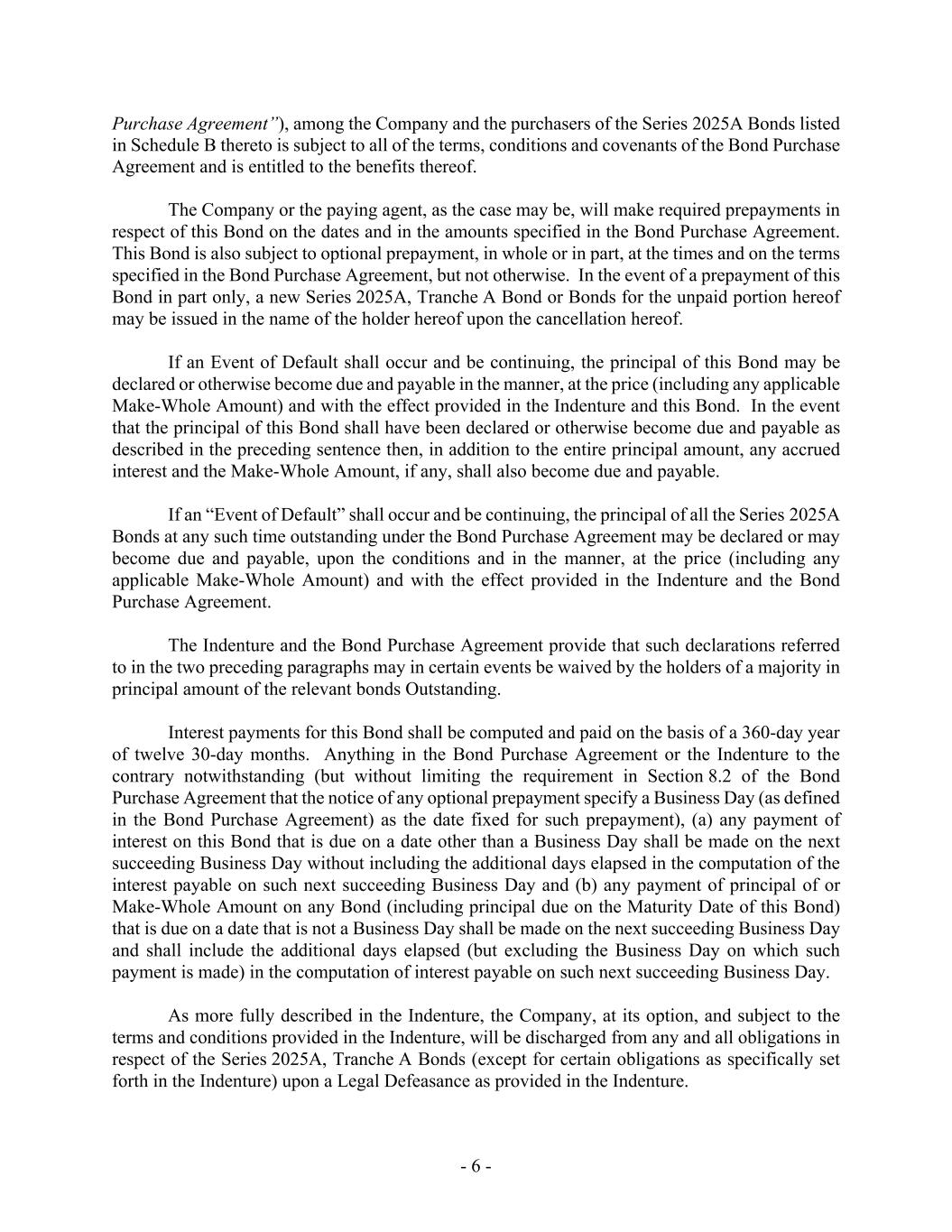 - 6 - Purchase Agreement”), among the Company and the purchasers of the Series 2025A Bonds listed in Schedule B thereto is subject to all of the terms, conditions and covenants of the Bond Purchase Agreement and is entitled to the benefits thereof. The Company or the paying agent, as the case may be, will make required prepayments in respect of this Bond on the dates and in the amounts specified in the Bond Purchase Agreement. This Bond is also subject to optional prepayment, in whole or in part, at the times and on the terms specified in the Bond Purchase Agreement, but not otherwise. In the event of a prepayment of this Bond in part only, a new Series 2025A, Tranche A Bond or Bonds for the unpaid portion hereof may be issued in the name of the holder hereof upon the cancellation hereof. If an Event of Default shall occur and be continuing, the principal of this Bond may be declared or otherwise become due and payable in the manner, at the price (including any applicable Make-Whole Amount) and with the effect provided in the Indenture and this Bond. In the event that the principal of this Bond shall have been declared or otherwise become due and payable as described in the preceding sentence then, in addition to the entire principal amount, any accrued interest and the Make-Whole Amount, if any, shall also become due and payable. If an “Event of Default” shall occur and be continuing, the principal of all the Series 2025A Bonds at any such time outstanding under the Bond Purchase Agreement may be declared or may become due and payable, upon the conditions and in the manner, at the price (including any applicable Make-Whole Amount) and with the effect provided in the Indenture and the Bond Purchase Agreement. The Indenture and the Bond Purchase Agreement provide that such declarations referred to in the two preceding paragraphs may in certain events be waived by the holders of a majority in principal amount of the relevant bonds Outstanding. Interest payments for this Bond shall be computed and paid on the basis of a 360-day year of twelve 30-day months. Anything in the Bond Purchase Agreement or the Indenture to the contrary notwithstanding (but without limiting the requirement in Section 8.2 of the Bond Purchase Agreement that the notice of any optional prepayment specify a Business Day (as defined in the Bond Purchase Agreement) as the date fixed for such prepayment), (a) any payment of interest on this Bond that is due on a date other than a Business Day shall be made on the next succeeding Business Day without including the additional days elapsed in the computation of the interest payable on such next succeeding Business Day and (b) any payment of principal of or Make-Whole Amount on any Bond (including principal due on the Maturity Date of this Bond) that is due on a date that is not a Business Day shall be made on the next succeeding Business Day and shall include the additional days elapsed (but excluding the Business Day on which such payment is made) in the computation of interest payable on such next succeeding Business Day. As more fully described in the Indenture, the Company, at its option, and subject to the terms and conditions provided in the Indenture, will be discharged from any and all obligations in respect of the Series 2025A, Tranche A Bonds (except for certain obligations as specifically set forth in the Indenture) upon a Legal Defeasance as provided in the Indenture.